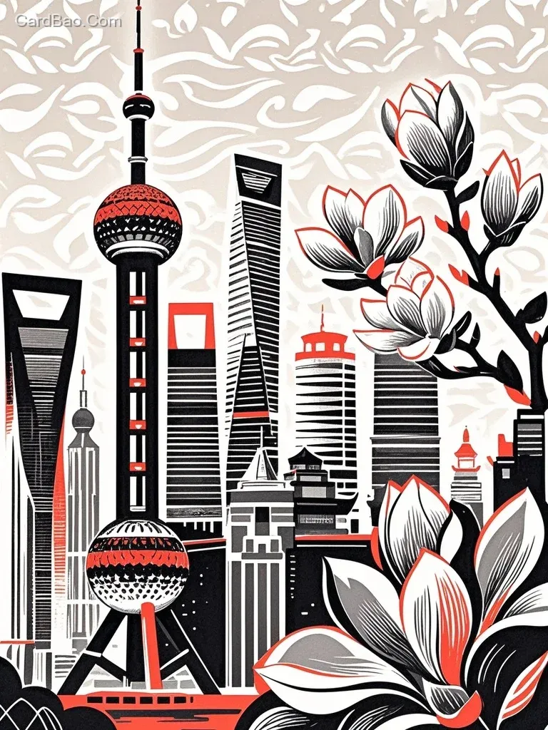 Vector illustration, woodcut art. Oriental Pearl Tower, Shanghai Bund, and magnolia flowers forming a decorative pattern. This design integrates patterns, lines, and aesthetic composition; with a white background, flat illustration, and vector illustration creating a rich cultural heritage. Exaggerated composition, black, white, and red color palette, clean lines, no shadows, gradient colors, masterpiece, minimalism, and generous negative space.