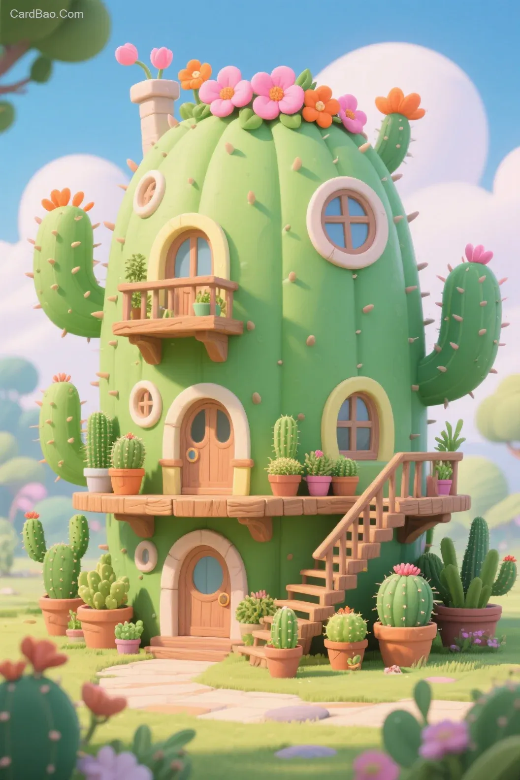 Illustration: In the scene, there is a uniquely shaped green house that resembles a cactus in appearance. It has a multi-story structure, decorated with round windows, arched doors, as well as wooden stairs and balconies. Around the house are placed multiple pots of cacti and other green plants, and the top is adorned with pink and orange flowers. The overall style is cute and full of childlike charm, creating a magical fairy-tale atmosphere.