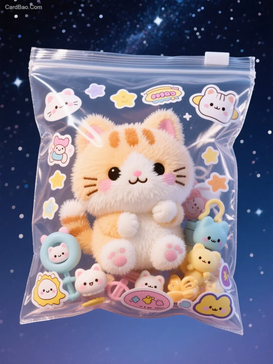 捏捏玩具,解压捏捏,Q版软毛毛猫猫,装在透明袋子里,袋子里有各种可爱的小配件,袋子上有各种小贴纸,星空背景