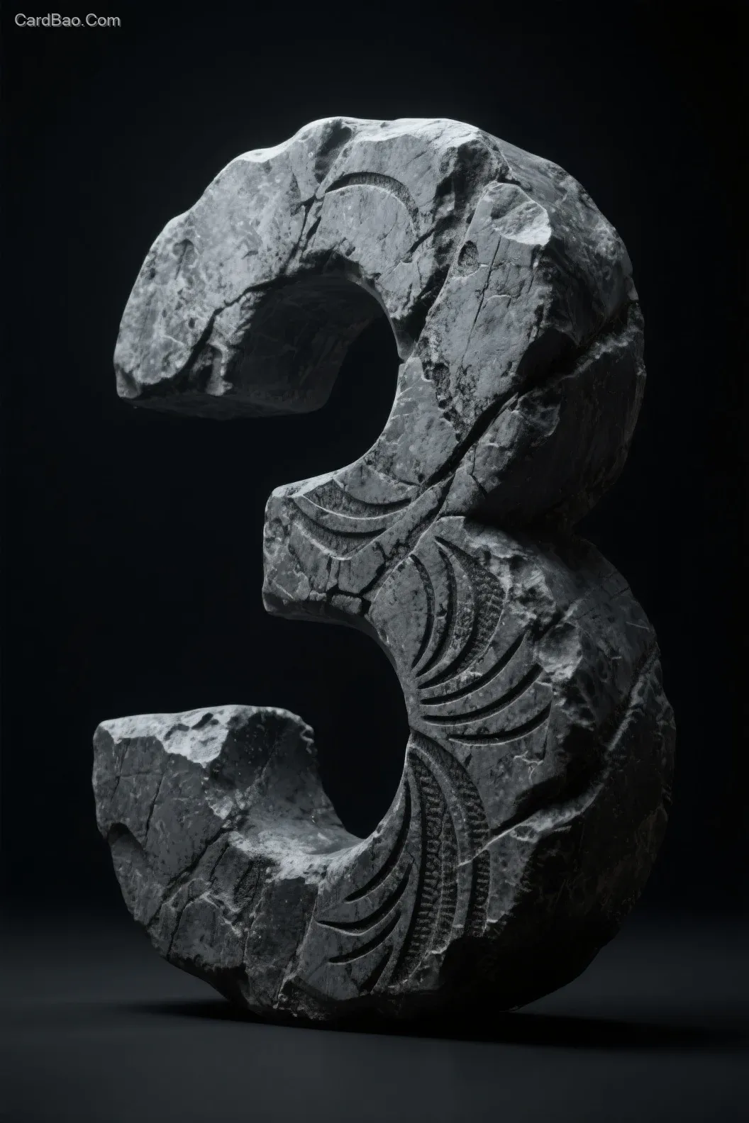 图片展示了一个由类似石头的材质制成的巨大三维数字"3"。这个数字雕刻得粗糙,几乎像是经过风化,呈现出自然有机的外观。背景完全为黑色,使得数字格外突出。数字位于图像中央,背景中没有其他物体或元素。数字的纹理非常细致,可以看到明显的线条和图案,表明它是从石头上雕刻或雕塑出来的