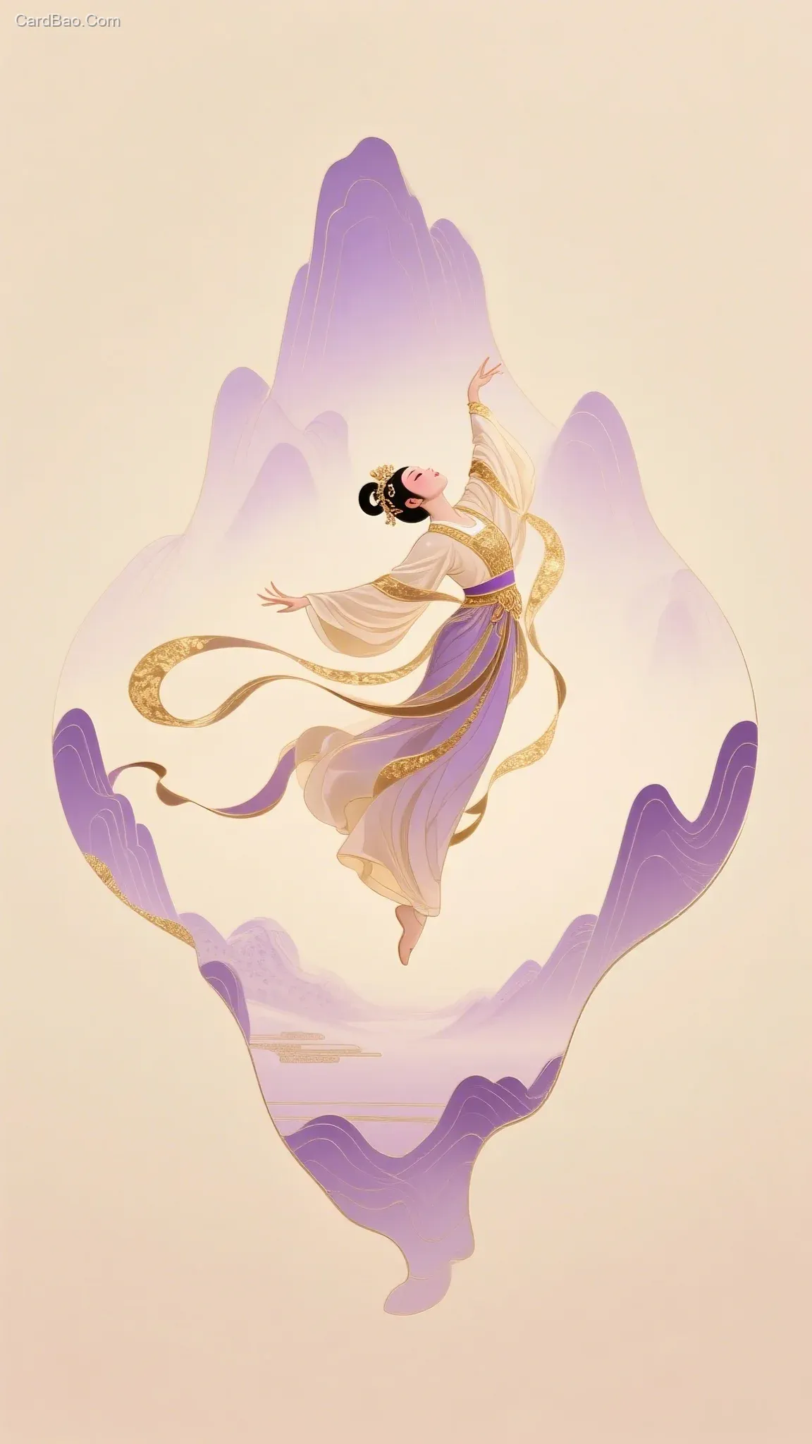 传统戏曲舞者腾空跃起插画,真丝长袍飘带形成抽象山水轮廓。奶油色背景配淡紫光晕,中心对称式构图,采用烫金工艺质感表现,适合国潮品牌产品包装设计