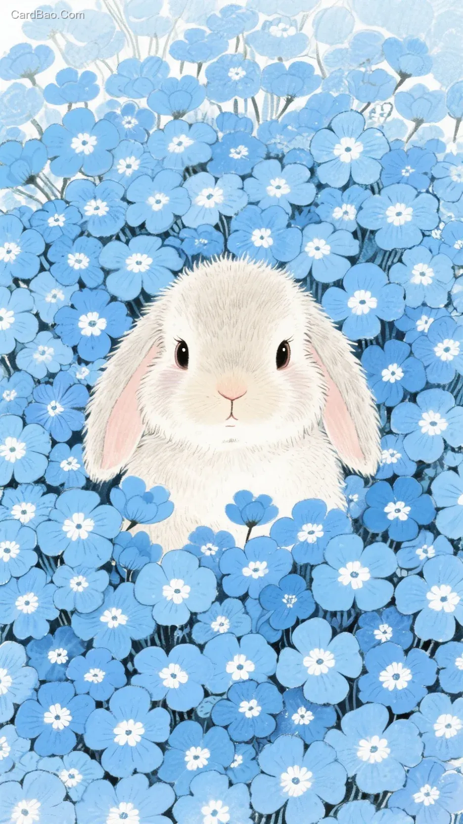 Healing illustration, picture book illustration, Chinese ink wash painting. Full-screen small flowers of various forms with blue as the main color tone, closely stacked together, revealing a cute fluffy lop-eared rabbit in the center. Fluffy texture, minimalism, high-definition quality, 8K.