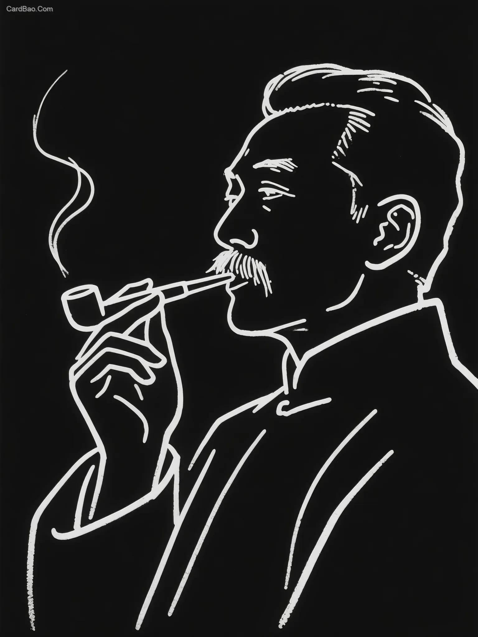 线条画,人物特写,以极简的线条勾勒出一代文豪鲁迅先生在用烟斗吸烟思考的轮廓 。画面采用黑白色调,以黑色为背景,白色线条在其上显得格外醒目。通过简洁流畅的线条来表现物体的形态和特征,强调形式和轮廓,舍弃了复杂的细节和色彩,给人一种简洁、抽象且富有韵味的视觉感受,通过这些线条感受到人物的气质和神态。