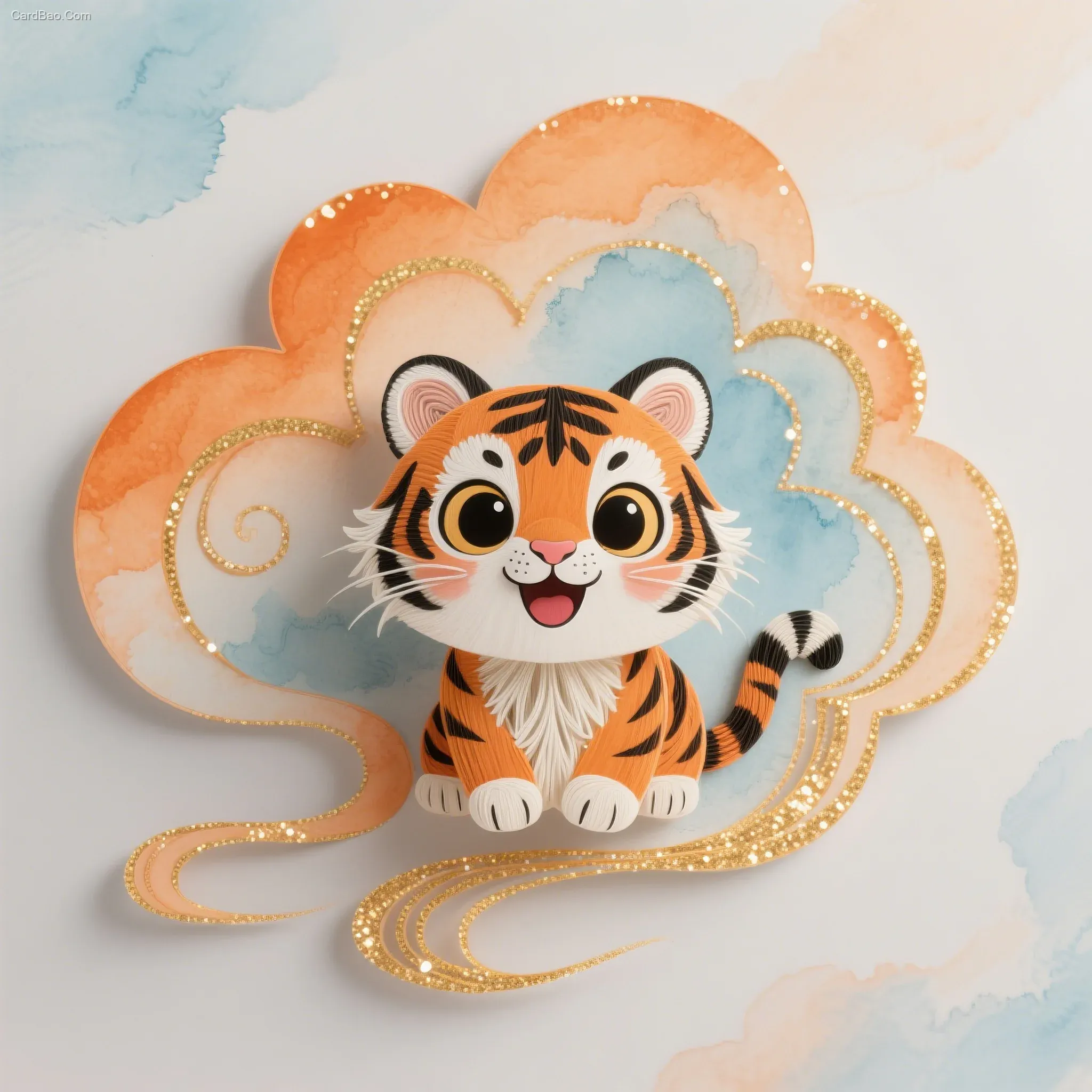 衍纸艺术,水墨风格,可爱萌宠虎,萌宠,大眼睛,开心地笑着,超级可爱的宠物,水彩画风格,手绘,干净背景,质感以橙色系为主,包含淡蓝色、浅灰色的渐变 。画面呈现类似祥云的形态,线条自然流畅。点缀着金色的线条和闪光效果,营造出优雅且富有层次感的氛围,整体风格大气且精致 。3D高清摄影