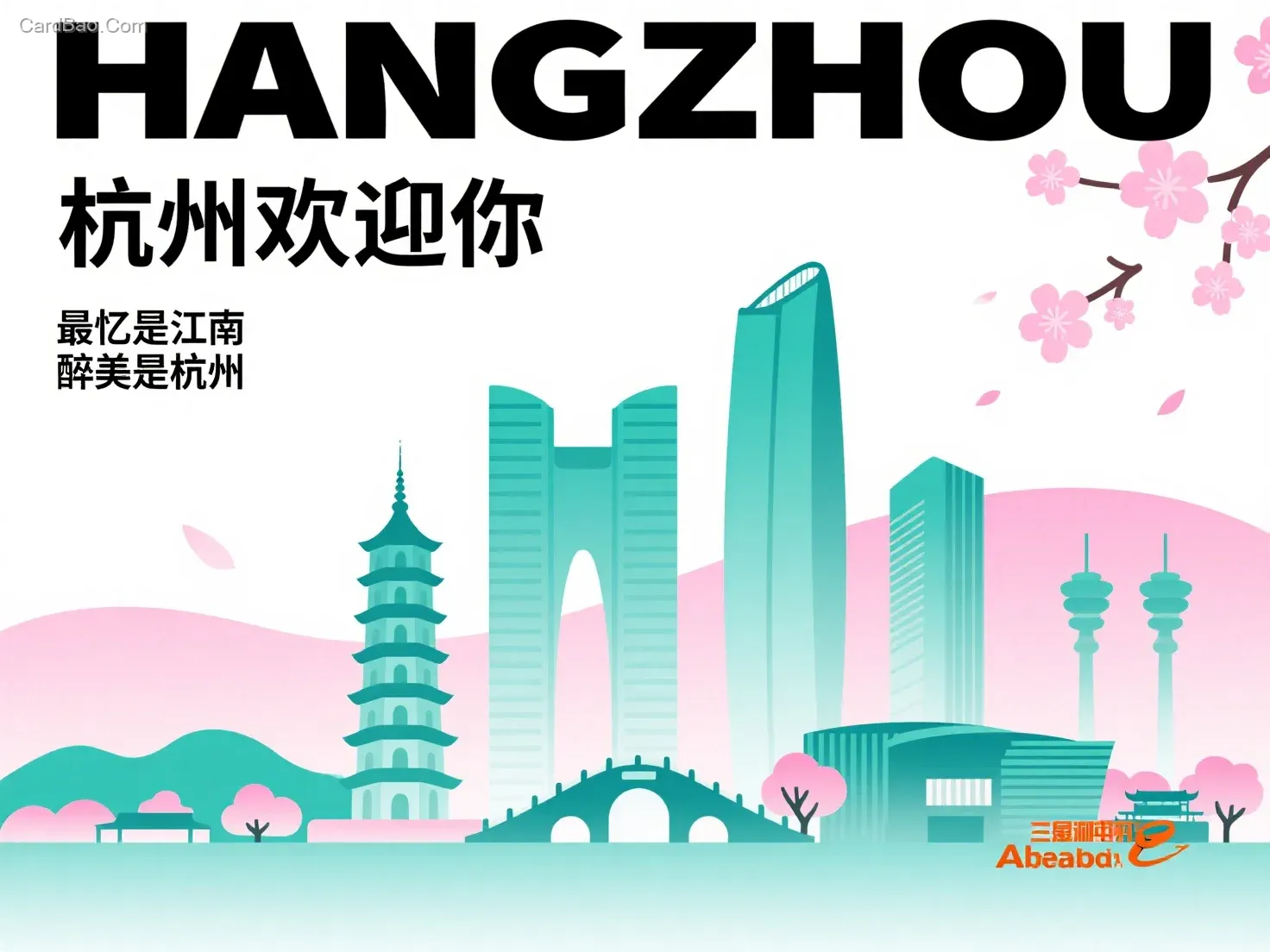 色彩:背景白色与淡粉樱花渐变,建筑水青绿渐变和淡淡粉渐变,建筑图案通透,色彩过渡自然,形成视觉冲击的同时又保持和谐。文字设计:上方以"HANGZHOU"黑色大字呈现,醒目突出。搭配"杭州欢迎你"搭配"Welcome to HangZhou"。文字排版集中且层次分明,强化了主题的传达。 接下来是左侧黑色小号细体字"最忆是江南 醉美是杭州"分两行左对齐。图形元素:杭州地标性建筑从左到右有序排列在中下方,如雷峰塔、钱江新城、拱宸桥、三潭印月、阿里巴巴总部等建筑图案元素排列在一排,前后错落。