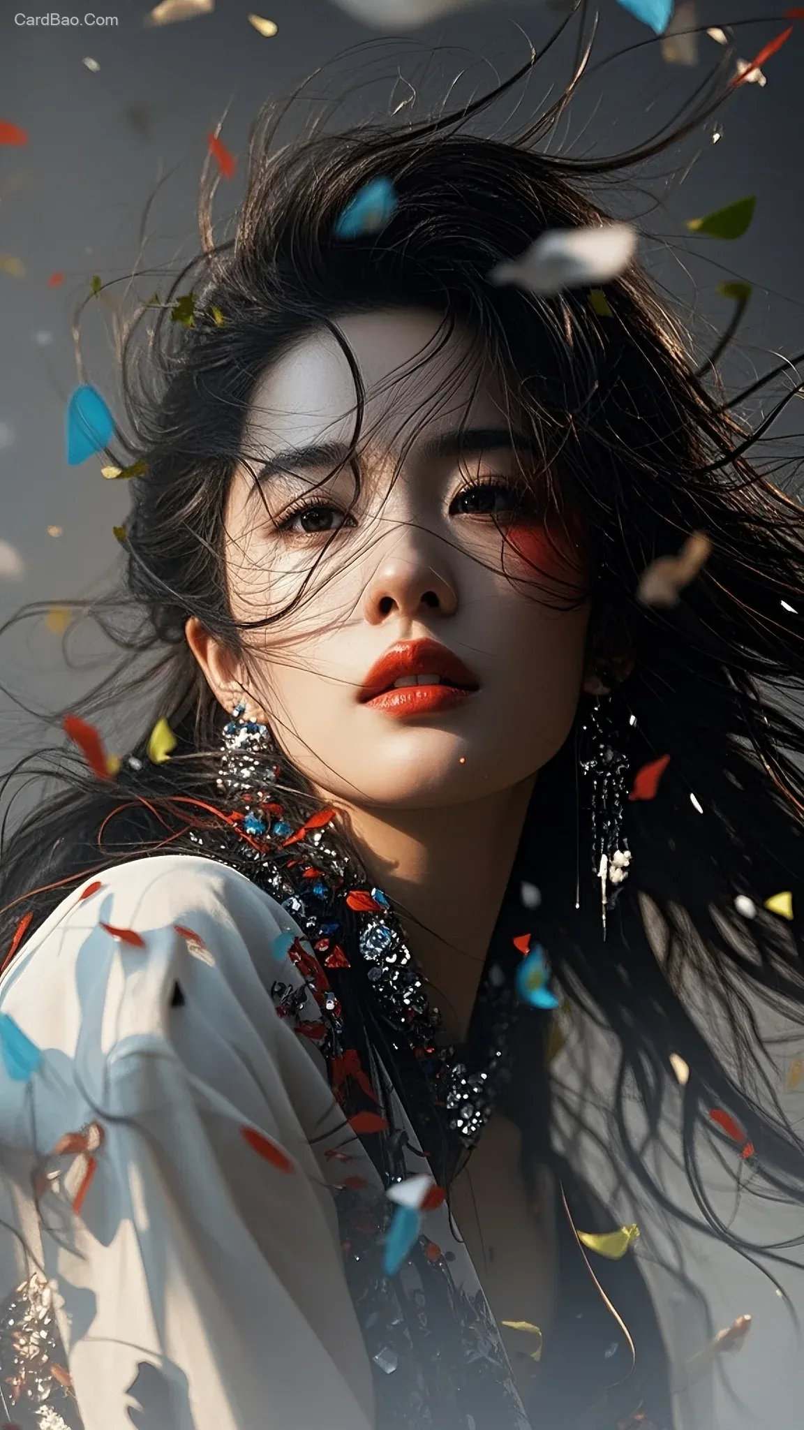 模糊,全局朦胧模糊,隐隐约约的模糊时尚前卫人像,刘亦霏人像,刘海凌乱,长发披肩,头发凌乱而突出,抽象,狂乱,妩媚,失控,动态模糊,边缘模糊,红蓝黑,灰调,暗黑,暗光,伦勃朗光,多重曝光,失焦,超广角,强透视,景深,高噪点,强烈的胶片颗粒感,动态美学,弥散晕染,朦胧美学,夸张构图,超现实,细节生动完美,杰作,高清渲染,脸部清晰,细腻画质,明暗对比,艳丽的油画质感,细腻肌理,超级精细CG,超高清,最高画质,写实逼真,微距镜头,面部阴影,面部聚焦,丰富细节,朦胧感,高级感,垂坠感,奢华氛围,光影美学,发型光,发丝光,伦勃朗光,精美繁复华丽风格,CG厚涂,32K高清画质,32K细腻真人皮肤纹理。前景有失焦绿叶落下