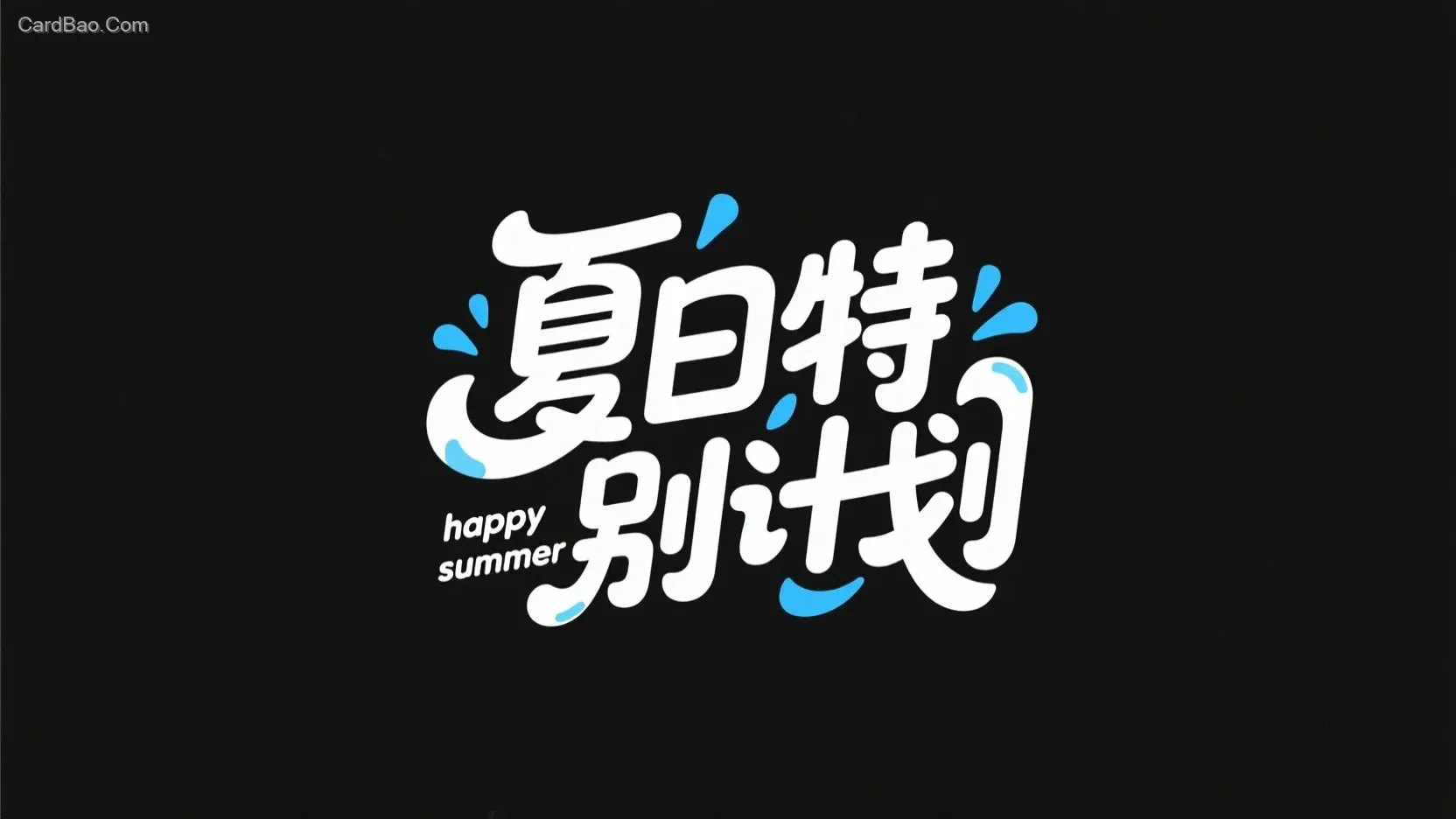 矢量插画,标志,纯黑色背景,白色中文字,中文“夏日特别计划”,创意字体设计Logo,流畅且富有艺术感,英文内容“happy summer ”,天蓝色点缀,设计灵感:将字体进行抽象变形,给人以强烈的视觉冲击,高级感,扁平化,字体灵动活泼,突出夏天的清爽感