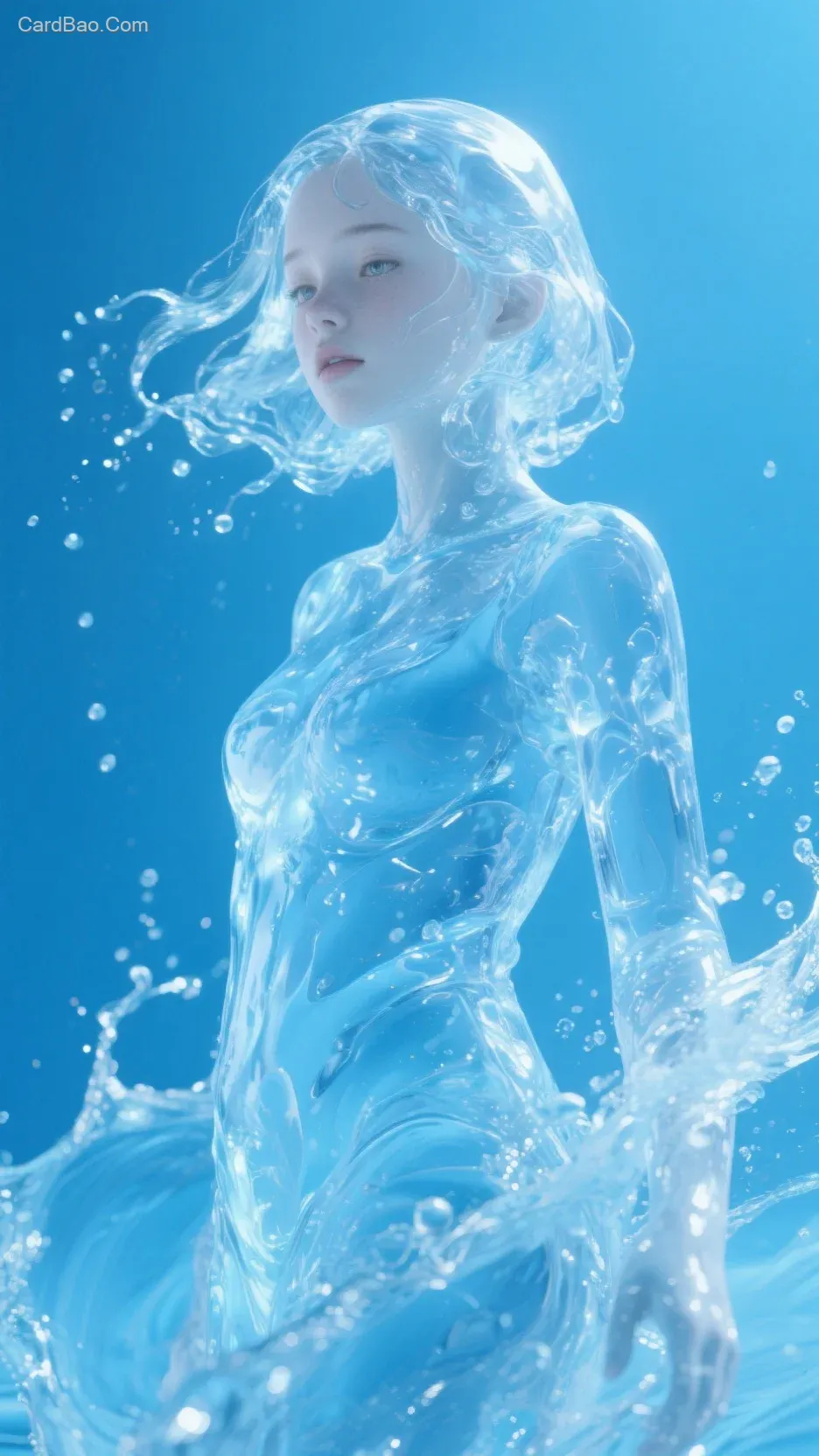 A crystal clear girl made of water,against a blue background,in a surreal photographic style with light blue and sky-blue tones,capturing the dynamic water surface,water splashed,with its body entirely composed of delicate water . The overall composition showcases intricate details in high-resolution,high-definition images,HDR质感