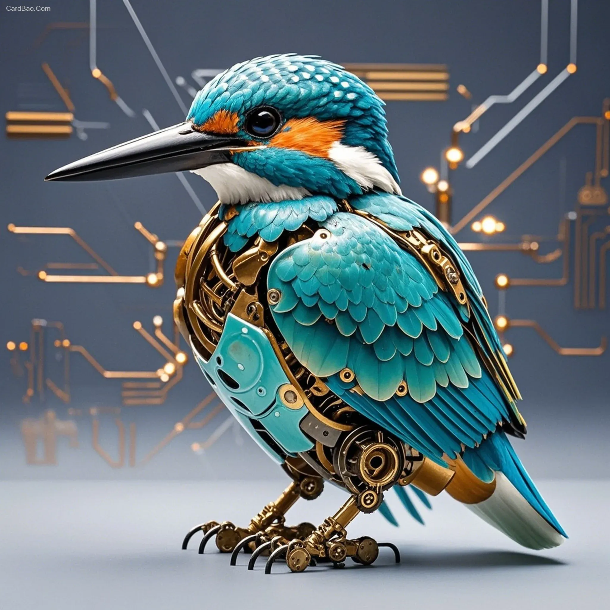 Please generate an image where the main subject is a kingfisher entirely constructed with mechanical structures. The entire surface of the kingfisher's body is covered with ceramic material, exuding the unique warm luster characteristic of ceramics. The feather parts boast vivid and striking colors, featuring a blue-green hue similar to that of a real kingfisher, yet rendered unique and tech-savvy due to the ceramic texture. The beak on its head is hard and sharp, with a metallic sheen, and the internal mechanical structures are faintly visible. Its legs are also composed of intricate mechanical structures, with gears and connecting rods clearly visible at the joints, as if ready to move flexibly at any moment. The background is simple, dominated by cool-toned, tech-inspired elements such as circuit board textures or light-shadow lines, further emphasizing the kingfisher's futuristic tech atmosphere.