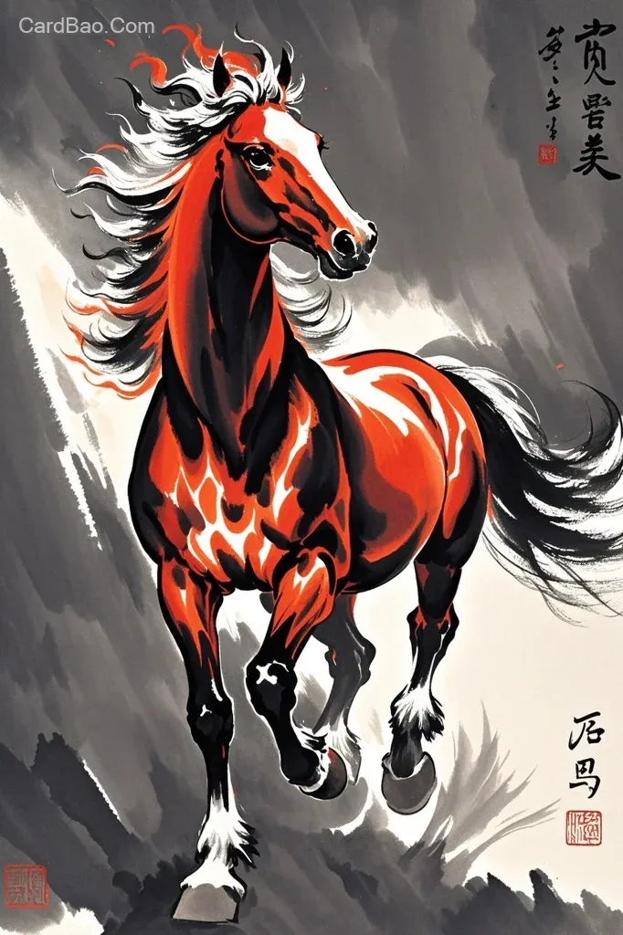 烈焰火驹奔腾姿态,墨色晕染的火焰鬃毛,泼墨飞白技法,深灰背景留白,传统水墨卷轴质感