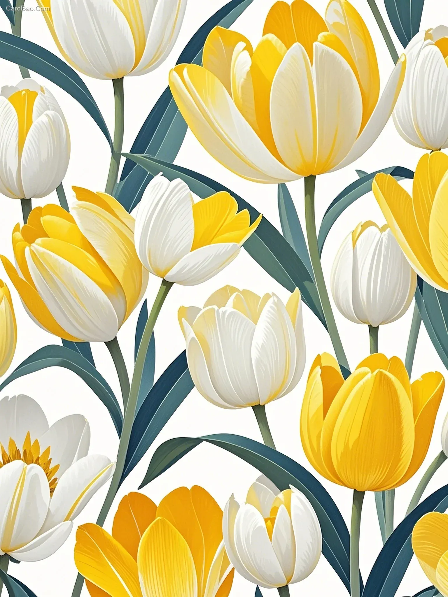 世界插画大师杰作,Yukiko Noritake,OC渲染,无缝拼接壁纸,一幅郁金香插画,白黄为主色调,白色背景