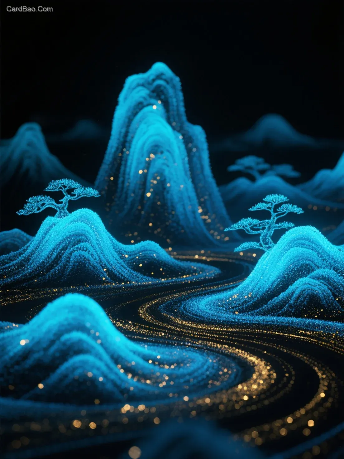 风格:蓝色弥散光影与水墨风格融合。零星金粉点缀。