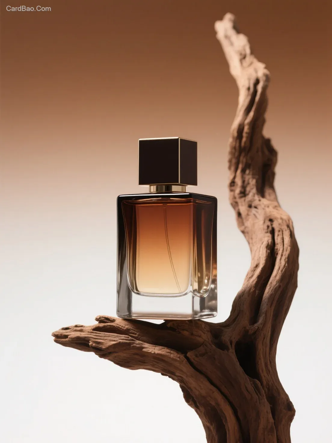 A perfume bottle made of glass, featuring a gradient from brown to transparent, with a square bottle cap, placed on a piece of wood. The wood stretches upward and is curved. Solid color background with a gradient from brown to white. Product photography, high saturation and contrast.