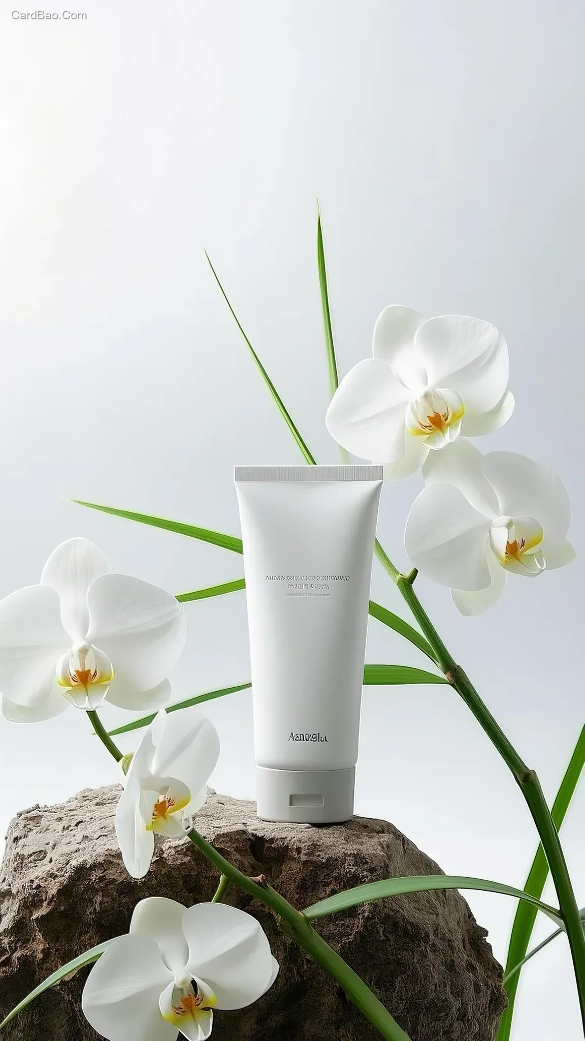 19h Minimalist, creative composition, medium and long view, product shooting, a white skin care product placed on a huge rock, white orchid, slender leaves, no text, a butterfly, Japanese Zen style, elegant, solid color background, verisimilitude, color level, depth of field, high quality, ultra-fine details, shot by Hasselblad