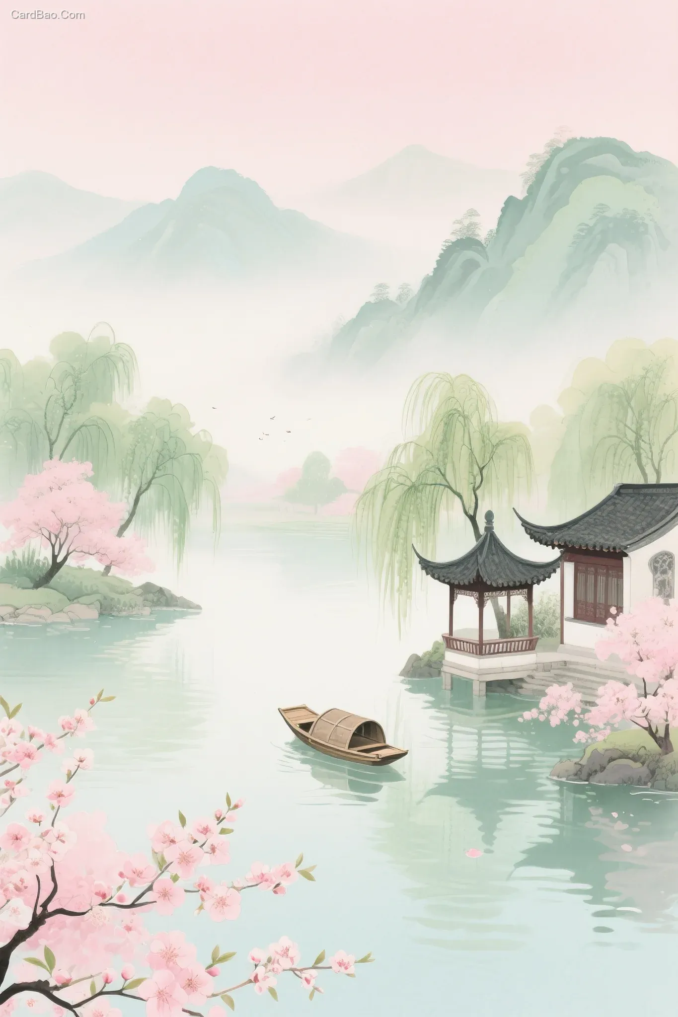 Plane vector illustration ,Elegant oriental landscape inspired by traditional Chinese aesthetics, featuring misty mountains, willow trees, and serene rivers in a classic Jiangnan style. Delicate pavilions by the water, small boats drifting gently, and blooming peach blossoms.soft pink and light green, with watercolor textures and gentle brush strokes.