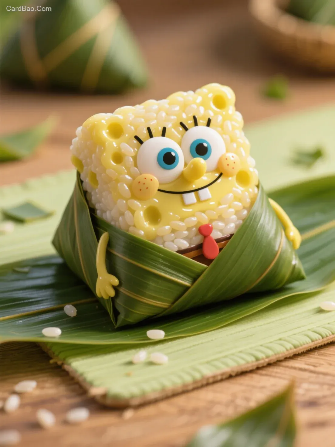The visual style is a realistic style with vibrant colors and rich details. A creative zongzi with glutinous rice as the main body, firmly wrapped in bamboo leaves into a SpongeBob SquarePants shape. SpongeBob's body is plump and has a cute shape; the glutinous rice grains are plump, shiny, and closely arranged, presenting a delicate texture. The SpongeBob zongzi is placed on a light green bamboo leaf mat, with some bamboo leaf fragments scattered around; the overall warm color tone highlights the cuteness of the zongzi. In terms of composition, the zongzi is located in the center of the frame, and the bamboo leaf mat occupies one-third of the frame, enhancing the stability of the composition.