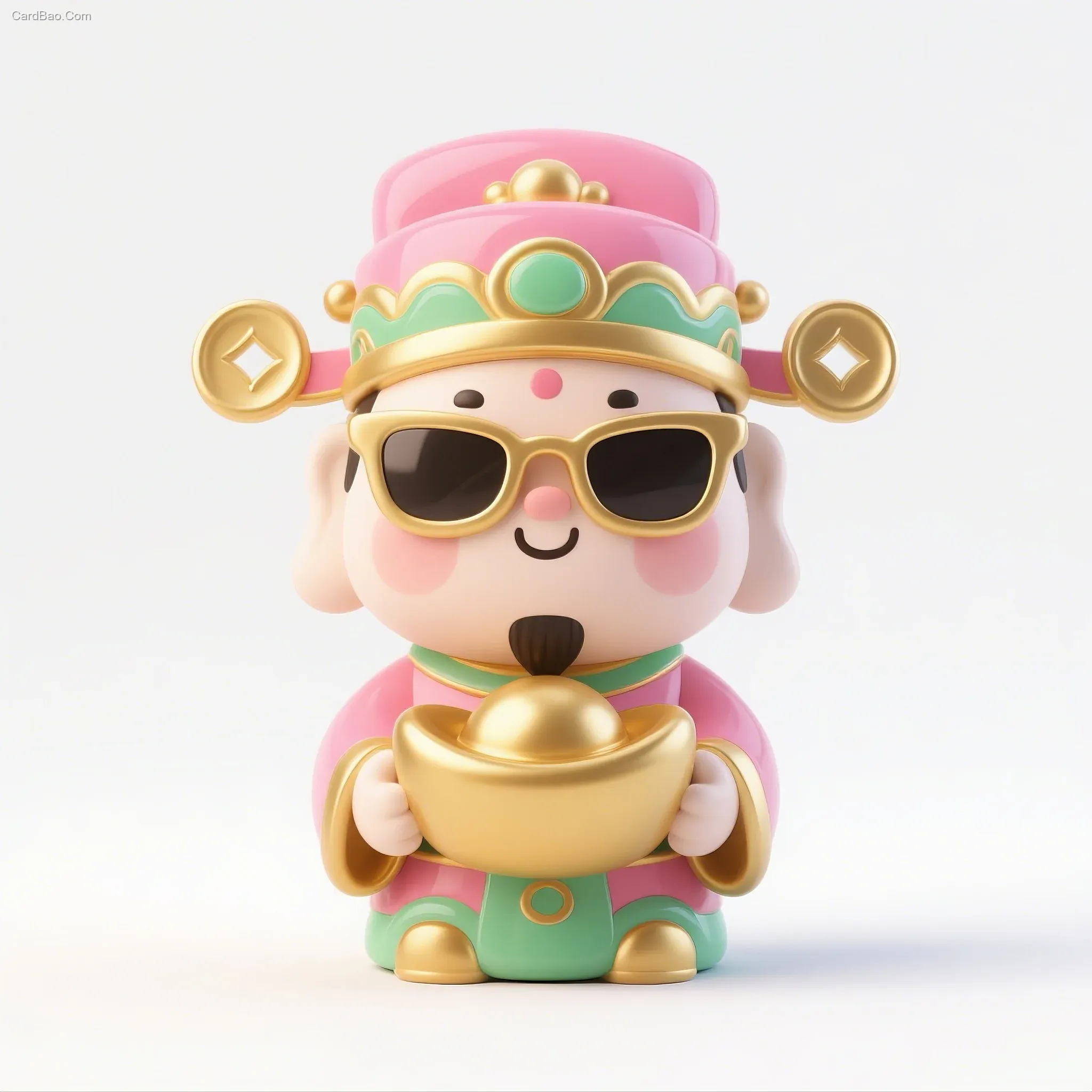 陶瓷,皮克斯风格,戴着墨镜的中国可爱财神,粉绿色金色,卡通人物,干净的白色背景,3D渲染,C4D