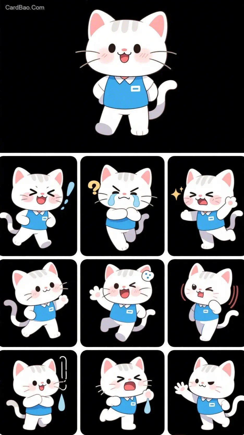 图片主体:一个可爱搞怪的动漫版【打工小猫】,脸部特征,上半身或全身。情绪:各种表情和动作,动作夸张,欢乐,生气,悲伤,愤怒,思考,拥抱,奔跑,招手等。风格:可爱动漫插画风格,白色和蓝色主色调。画质:精致的细节,超高清,8k。图片布局:3x3 网格图,一个网格一个头像,不显示网格线,白色背景