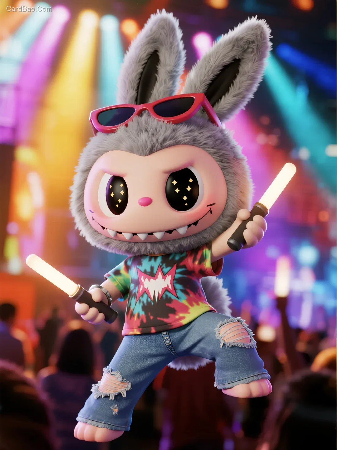 泡泡玛特,拉布布,LABUBU, 盲盒风格, 拟人化角色, 兔子耳朵, 灰色毛发, 大眼睛, 黑色瞳孔, 9颗尖牙齿, 粉红色脸颊。戴着墨镜,摇滚服装,拉布布在音乐节现场手举荧光棒随音乐摇摆,眼睛看向镜头。身穿扎染T恤和破洞牛仔裤,周围有彩色灯光和舞台,毛绒材质,3D卡通渲染风格