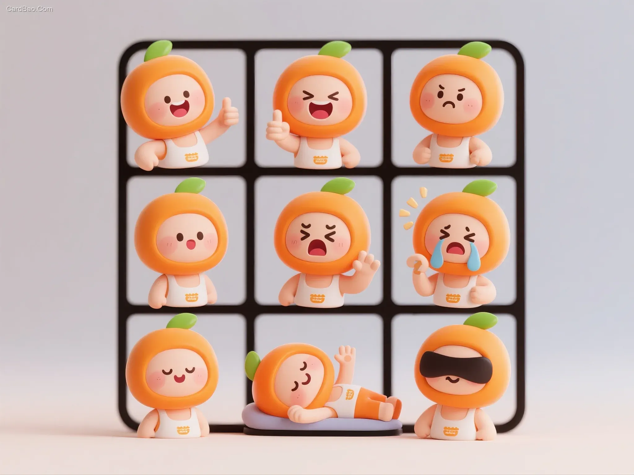 图片主体:3D卡通角色设计,盲盒,橙色,芒果宝宝头套拟人,身穿小背心,卖萌。情绪:各种夸张的表情和动作,包括:开心,大笑、点赞、发火、大哭,思考,躺平,打招呼、睡觉等风格:盲盒风格,橙色主色调。画质:精致的细节,高清,4k。图片布局:九宫格,每个格子一个头像,对应一种情绪,不显示网格线,干净背景,高级,充满创意。