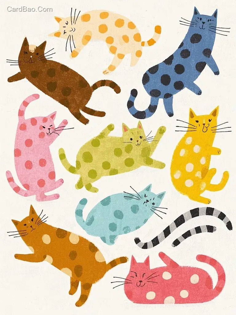 主体:许多小猫,抽象风格,猫瘦、动作、表情各不相同。小猫颜色:小猫颜色各不相同,身上有波点图案。风格俏皮又卡通。风格俏皮超现实,边缘柔和圆润,营造出梦幻般的氛围。治愈插画色调搭配。