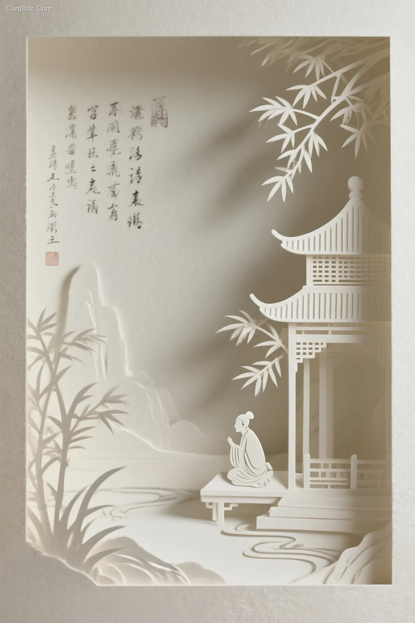 禅意,东方美学,极简主义,特写,侧面视角,柔光,纸雕工艺展现中国古诗场景,古代中国艺术精髓,细腻刀工勾勒诗意画面,东方主义意象流淌于宁静画面,纸雕质感如古老宣纸,充满信仰感。中国风,简约风,古典美,低饱和度色彩,治愈氛围,纸雕工艺,中国古诗场景,古代中国艺术,极简主义,宁静。