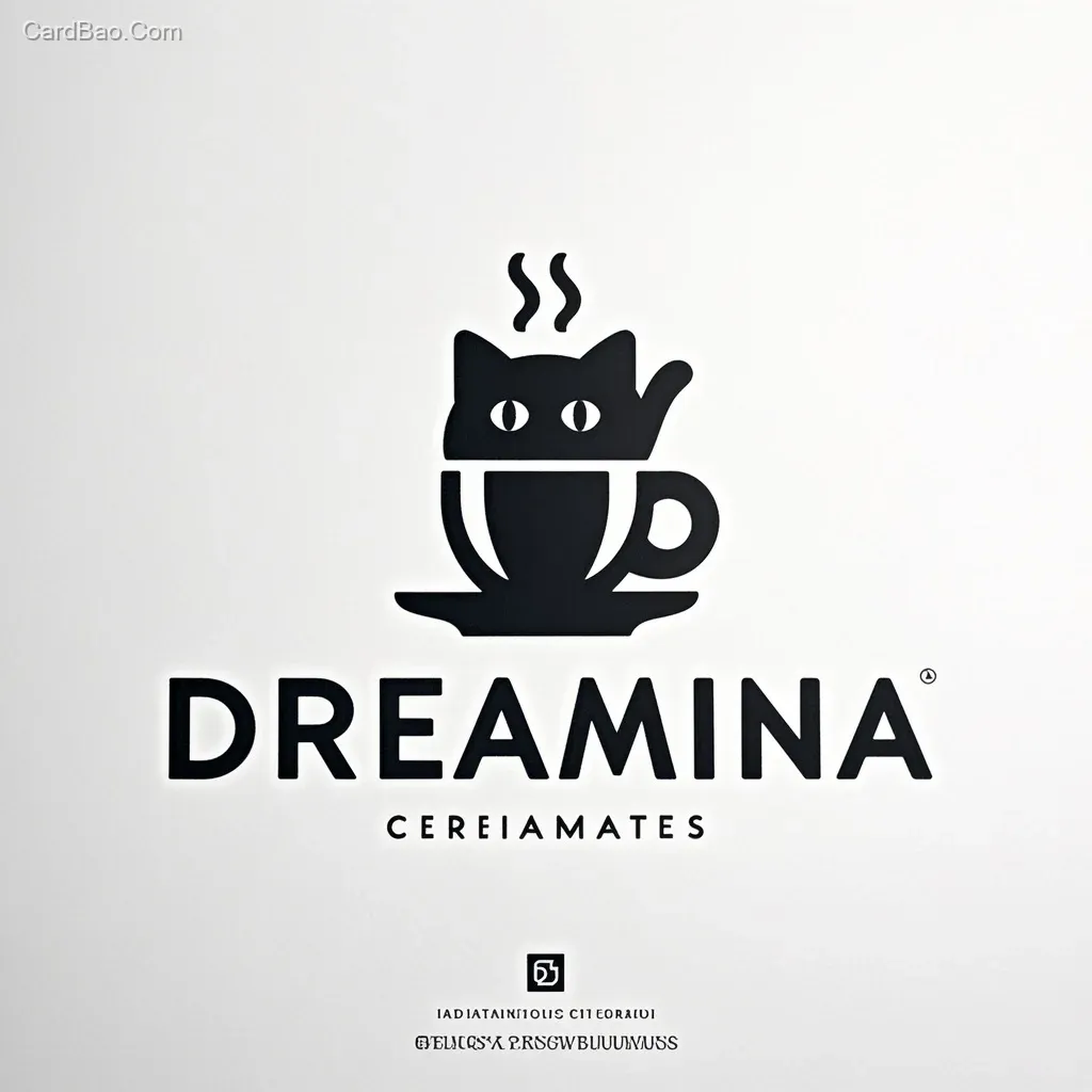 logo品牌标志,极简,图型设计,写着英文“DREAMINA",猫与咖啡的的融合,国际化,丝印冷烫,高级感,扁平化,设计感
