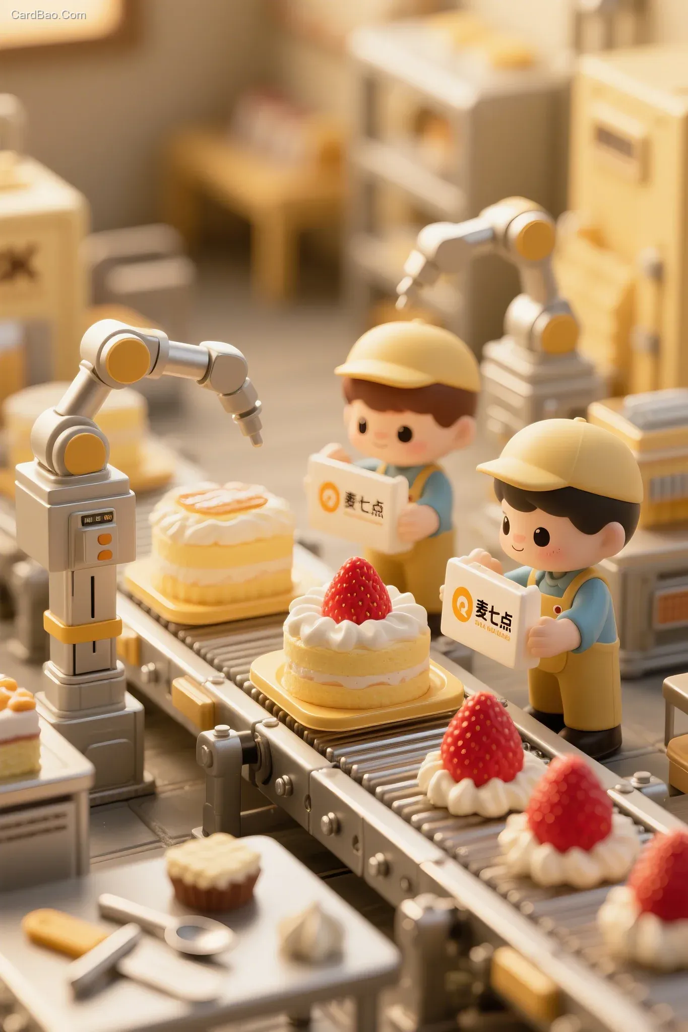 微缩模型场景,流水线传送带运输草莓奶油蛋糕,三两个Q版工人模型在检查设备,微型机械臂正在包装提拉米苏,提拉米苏上有“麦七点”logo纸牌,Q版模型风格,柔和布光展现塑料质感,浅景深突出立体层次,高精度微距摄影,8K工业设计渲染,暖黄色调营造烘焙工坊氛围,塑料机械零件带有奶油质感,传送带反射哑光涂层,工作台散落糖霜工具