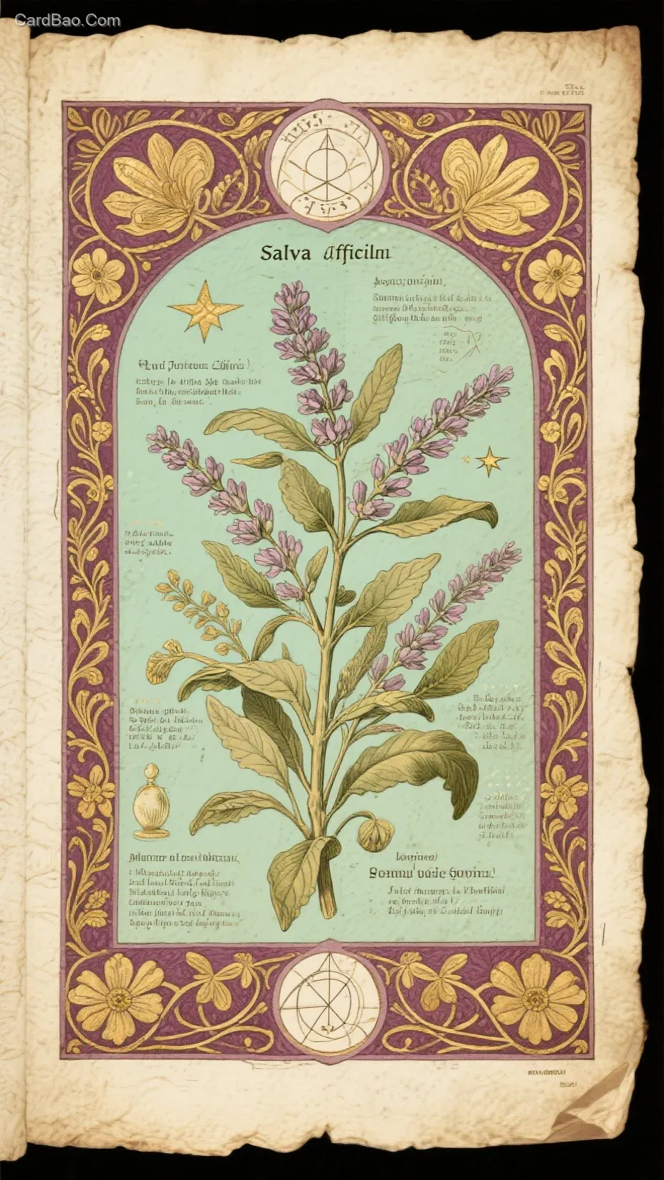 An illustration in the style of a magical plant compendium, featuring Salvia officinalis (common sage). The overall style blends medieval alchemical manuscripts with Art Nouveau (Mucha-inspired style). The background is aged parchment, with natural paper texture and faintly yellowed edges. The sage is exquisitely rendered using relief-style lines and soft color tones, surrounded by gold floral borders, Gothic-style frames, and mystical alchemical symbols. The illustration includes elements such as magical properties (e.g., wisdom, purification, protection), the corresponding celestial body (Jupiter), uses (making tea, incense, burning for purification), and the botanical Latin name. The overall color palette consists of vintage green, gold, and magenta, evoking the atmosphere of an alchemical manuscript from a fantasy world—exquisite, mystical, and rich in historical depth.