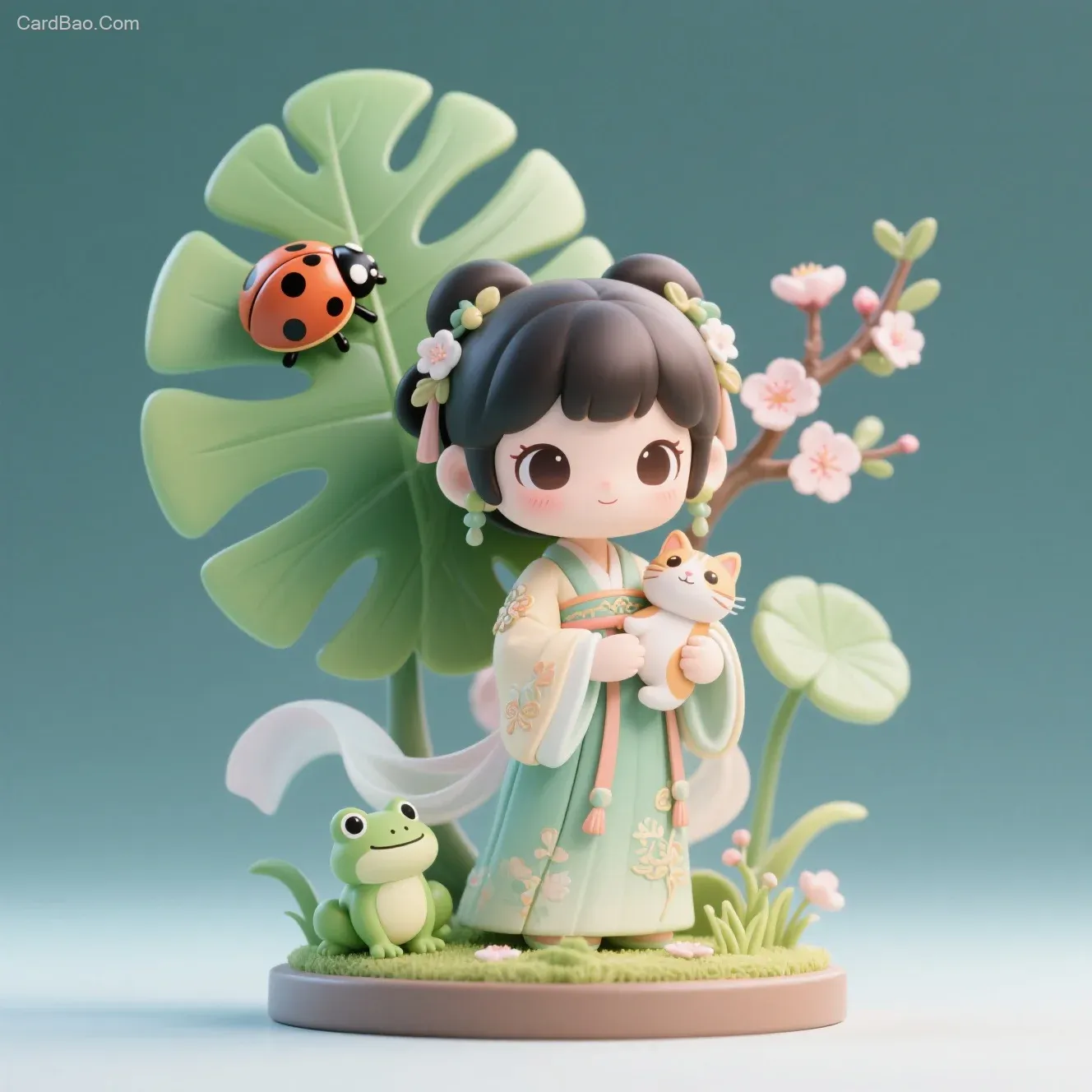 特写高清视角,一个精美复杂的Q版古风二次元女孩穿着汉服,可爱,手办摆台、精巧制作,配件丰富有大大的龟背竹叶子,叶子上面有一只七星瓢虫,背后有一枝杏花,小青蛙,抱着小猫,小草元素,背景纯色简约,整体场景色彩清新明亮,营造出梦幻、甜美的童话氛围,二次元手绘风格,潮玩摆件设计,中景,可爱梦幻氛围