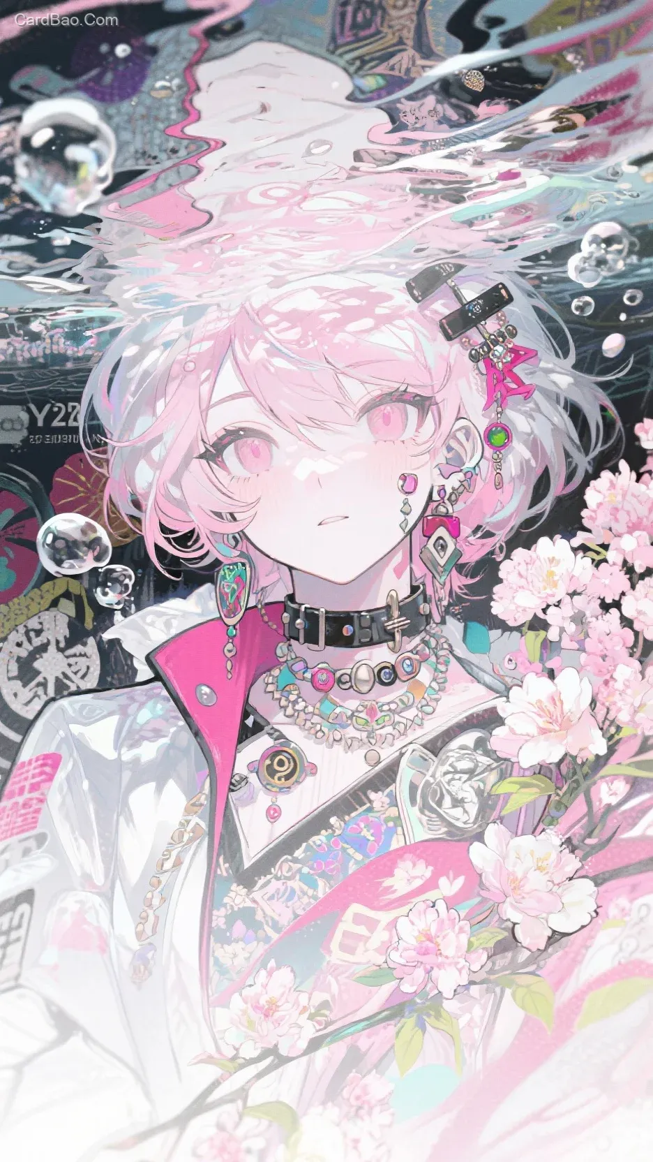 Y2K, multi-dimensional consciousness space, time machine, stream of consciousness, integration and interweaving of scenes and characters, spatial distortion, depth of field, grand scene, richly colored oil painting, vibrant color saturation, smooth color blending, delicate brushstrokes, cel-shading style, 2D anime, vintage manga, facial close-up, detailed face, adorned with various accessories, background filled with Japanese subculture elements, overall punk style, flat coloring technique, pink and white color scheme, Japanese manga. Richly pigmented oil painting, full-bodied colors, soft color晕染 (color smudging),细腻 brushwork, ink wash rendering, aesthetically pleasing, abstract watercolor, underwater world, vibrant and colorful, central composition, warm fair skin with pearlescent texture, tactile grain, acrylic painting, portrait illustration combining multiple techniques, breaking conventions, anti-design, transcending eras, interweaving of reality and illusion, art with unconventional composition, iridescence, reflections, dreamlike, faint light, Chinese dreamcore illustration, Chinese aesthetic, grotesque art, high-end atmosphere, translucent, luminous, iridescent, divine aura of celestial beings, spring ambiance, paired with thick oil painting brushstrokes, beautiful dreamlike light and shadow, transparent highlights with soft bokeh effect, gorgeous and stunning atmosphere infused with romance, simple yet elegant. Colorful background, bold brushstrokes, rich oil painting texture, floral element atmospheric illustration, illustration art, best quality, high-resolution 64K masterpiece, contrast between warm and cool tones, surreal dreamlike aesthetics, Octane Renderer's photon tracing mode, trendy surrealism, rich in details, highly artistic, anime visual effects.