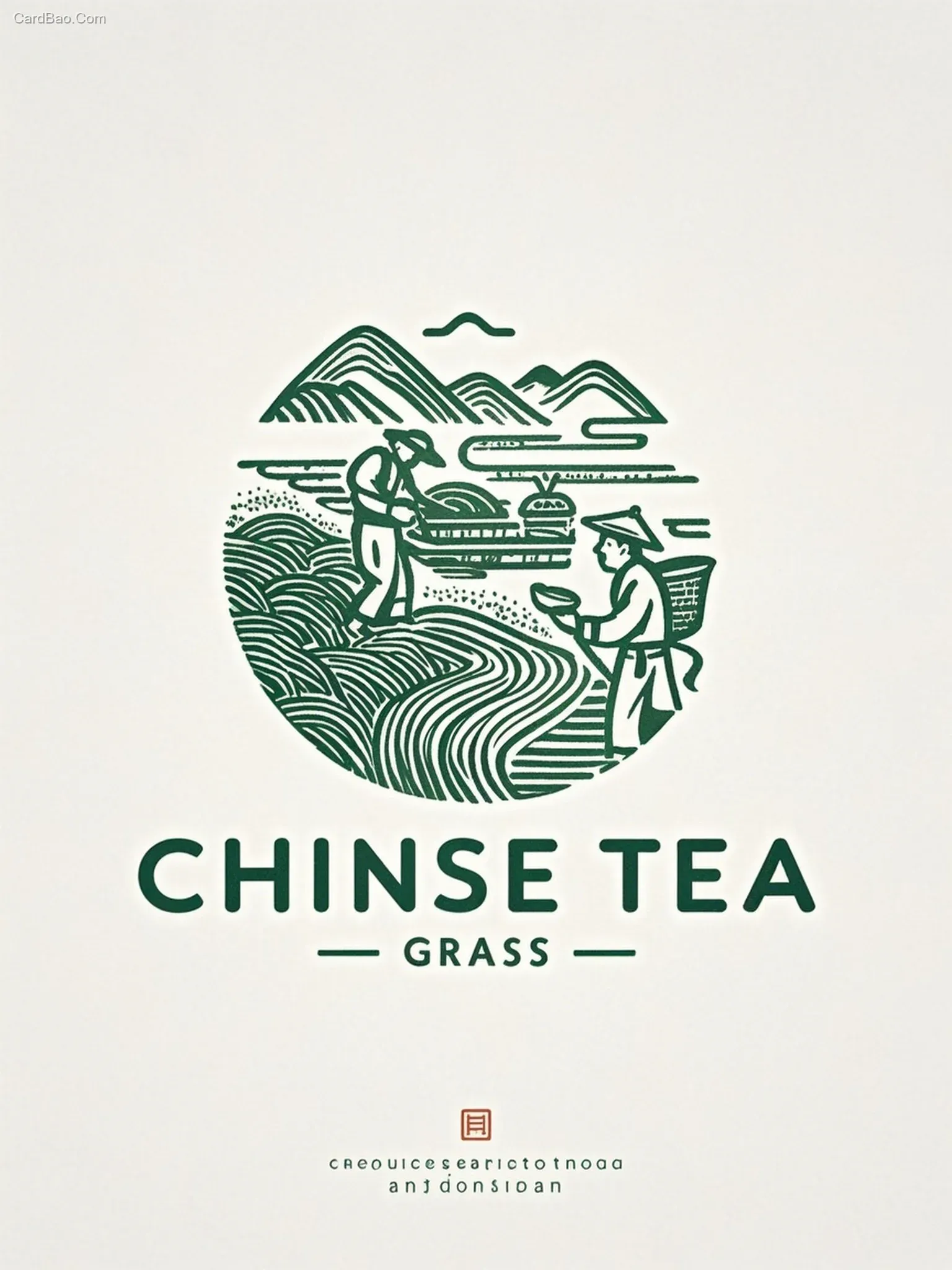 Vector illustration, logo, white background, Song Dynasty Gongbi (meticulous brushwork), composed of extremely fine lines, simple composition, depicting Song Dynasty tea farmers picking tea leaves on tea mountains, showcasing Song Dynasty charm, minimalism, predominantly dark green, international, sophisticated feel, flat design, strong design sense, with text at the bottom: "CHINESE TEA" and small text "grass"