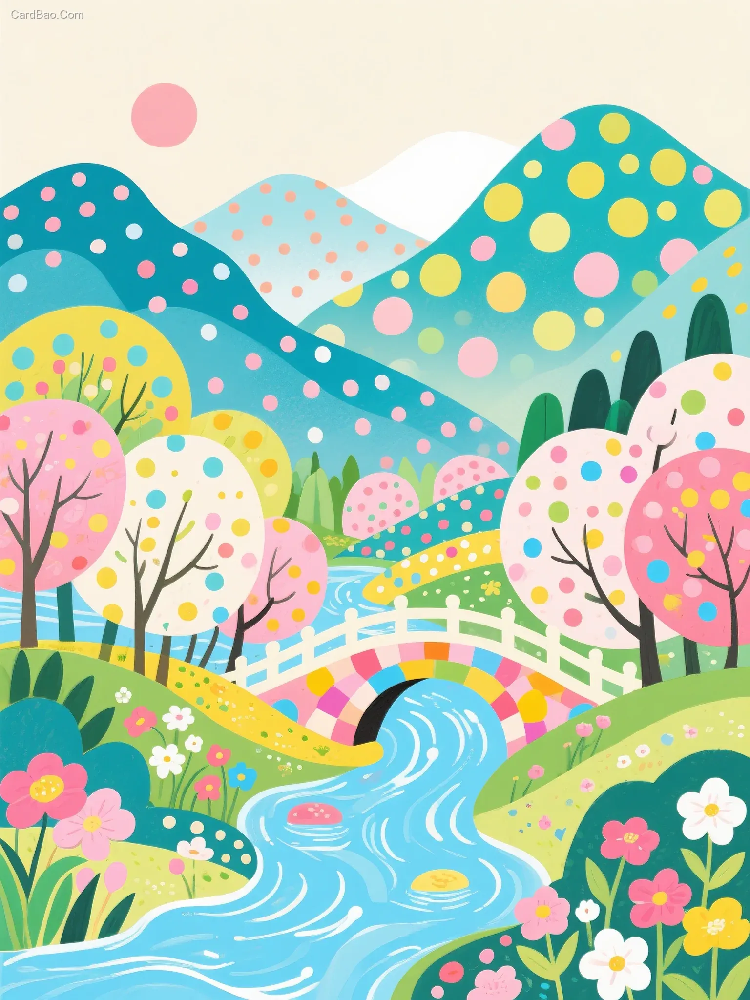 Liuhua风格,山水插画,波点艺术,治愈系风景,春色,抽象花朵,水桥流水,五彩斑斓,当代艺术。