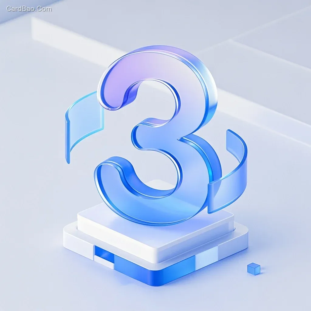 在白色背景下,呈现一个采用透明玻璃材质制作的、具有3D效果的磨砂玻璃数字“3”图标,该图标为蓝白渐变色调,从等距视角展示,呈现出彩色渐变数字3的独特效果,画面高清,分辨率为1080
