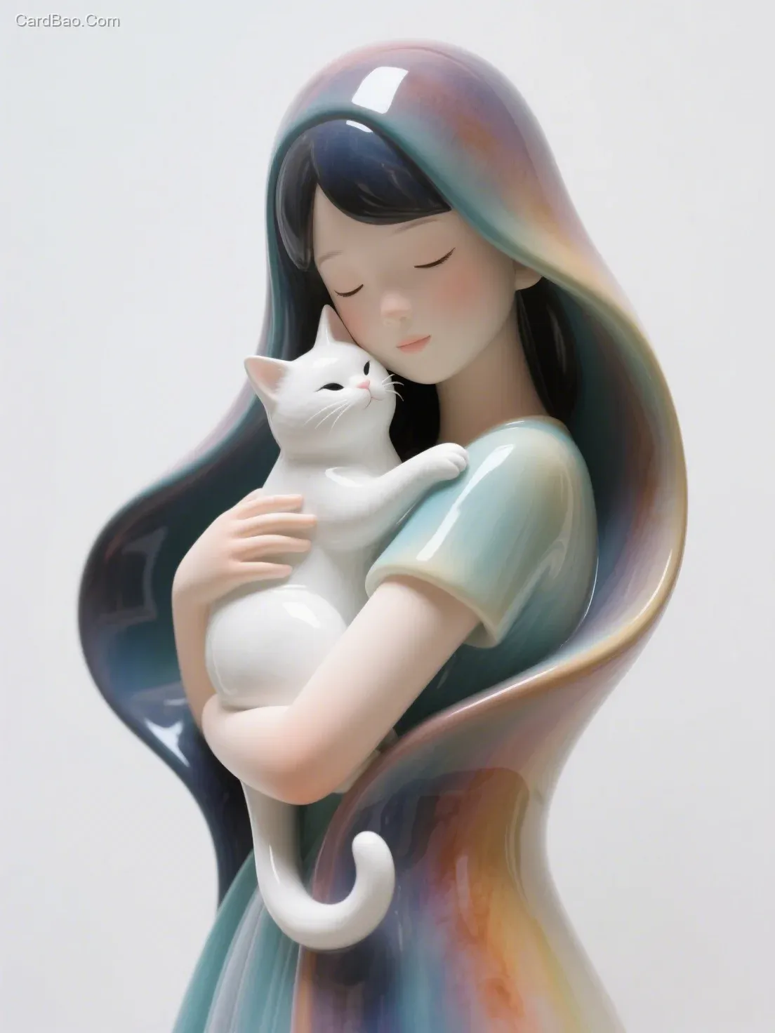 Modern and creative colored glaze sculpture, girl holding a white cat, healing colors, smooth lines, white-toned background