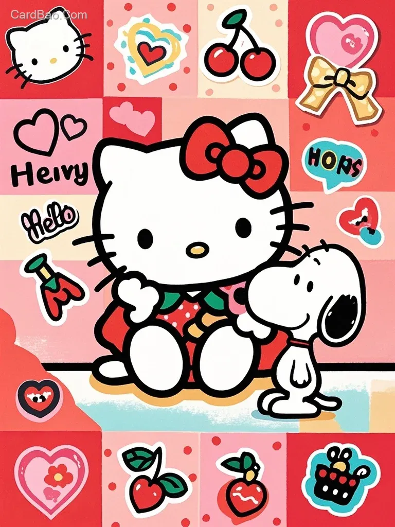 hello kitty艺术插画,扁平风格,手绘风格,大胆的粗线条,多巴胺纯色块,Q萌的史努比,元素贴纸,涂鸦艺术,混合图案,表情符号,爱心、樱桃、蝴蝶结元素、矢量设计,简单的平面插画,极简,留白
