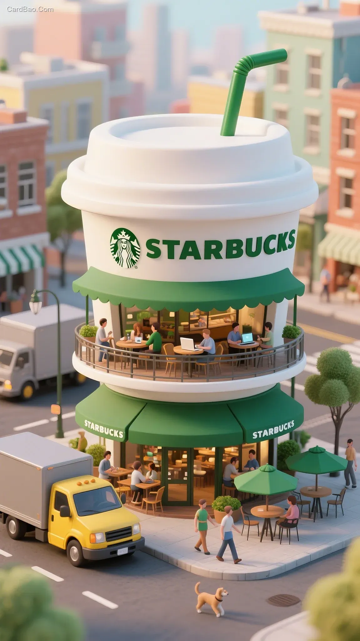 3D 渲染,微缩风格,主体为巨大的星巴克咖啡杯造型建筑,白色杯身搭配绿色 “STARBUCKS” 标志与美人鱼 logo,顶部绿色吸管。建筑两层结构,一层设绿色遮阳篷,内部及门口有顾客活动;二层带阳台,摆放桌椅,人们或使用电脑或交流。外部环绕城市街景,黄色车辆、灰色货车行驶,路边配置绿色遮阳伞与桌椅,行人携犬漫步,背景可见其他建筑,整体营造出温馨且充满活力的都市休闲氛围,细节丰富,色彩协调,尽显星巴克品牌特色。