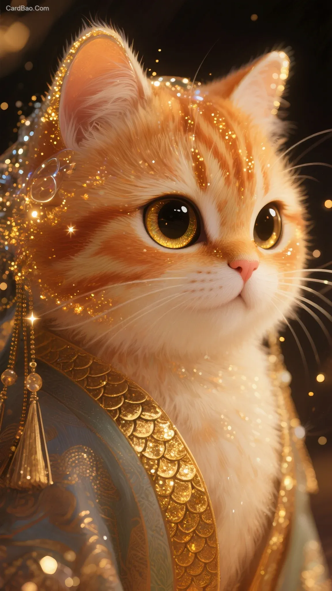 一个由粒子组成的古风插画,笔触,明暗对比,超高清,垂坠感,高级感,最高画质,细腻渲染,邪魅,粒子发光生物发光金色闪片透明流体环绕眼眸,丰富细节,朦胧感,鳞片,河灿烂的眼眸,从眉眼间飘过行云流水和万千星展,头部特写,面部阴影,丰富的细节,高质量,流苏装饰,丰富的细节 胖橘猫(绒毛质感蓬松柔软呈现渐变条纹,圆润眼反射环形柔光板高光,立体鼻头,侧逆光勾勒绒毛边缘金色辉光,Q弹脸颊轮廓,高速同步闪光凝固飘散在空中的粒子,迪士尼卡通材质渲染技术展现细腻布纹肌理)厚涂 插画写实逼真,艳丽的油画质感,细腻肌理,bjd,罩染