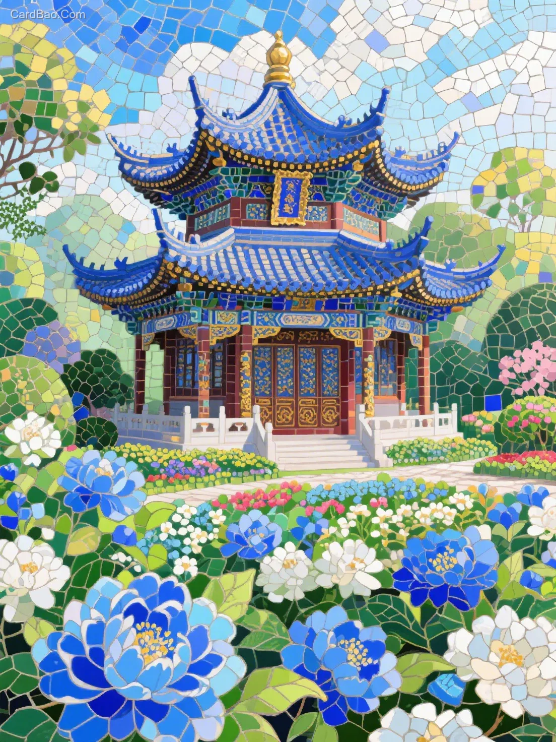 帮我生成一张图片:此图像是一幅充满活力的数字绘画,采用细小零碎的马赛克艺术风格。它描绘了一座华丽的传统中国建筑,有着复杂的蓝色和金色细节,周围环绕着郁郁葱葱的多彩花园,花园里种满了蓝色、绿色和白色的花朵。建筑展示了弯曲的屋顶和装饰图案,而花园则盛开着大而风格化的花朵。该场景纹理丰富,视觉上引人注目,将传统图案与当代数字艺术技术融为一体。比例 2:3。