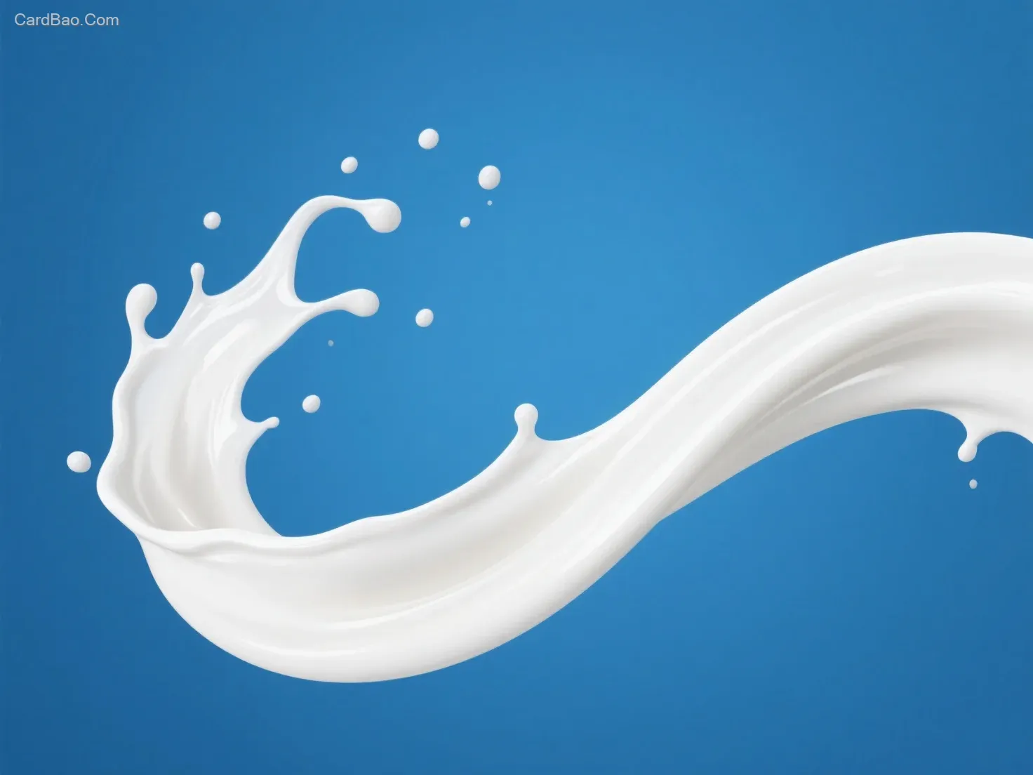这张图以蓝色为背景 ,主体是白色的牛奶飞溅、流动的形态。牛奶呈现出富有动感的曲线和液滴,仿佛正从画面左侧飞溅而出,在右侧形成柔和的起伏,整体视觉效果灵动且具有质感,营造出一种活力与清新的氛围