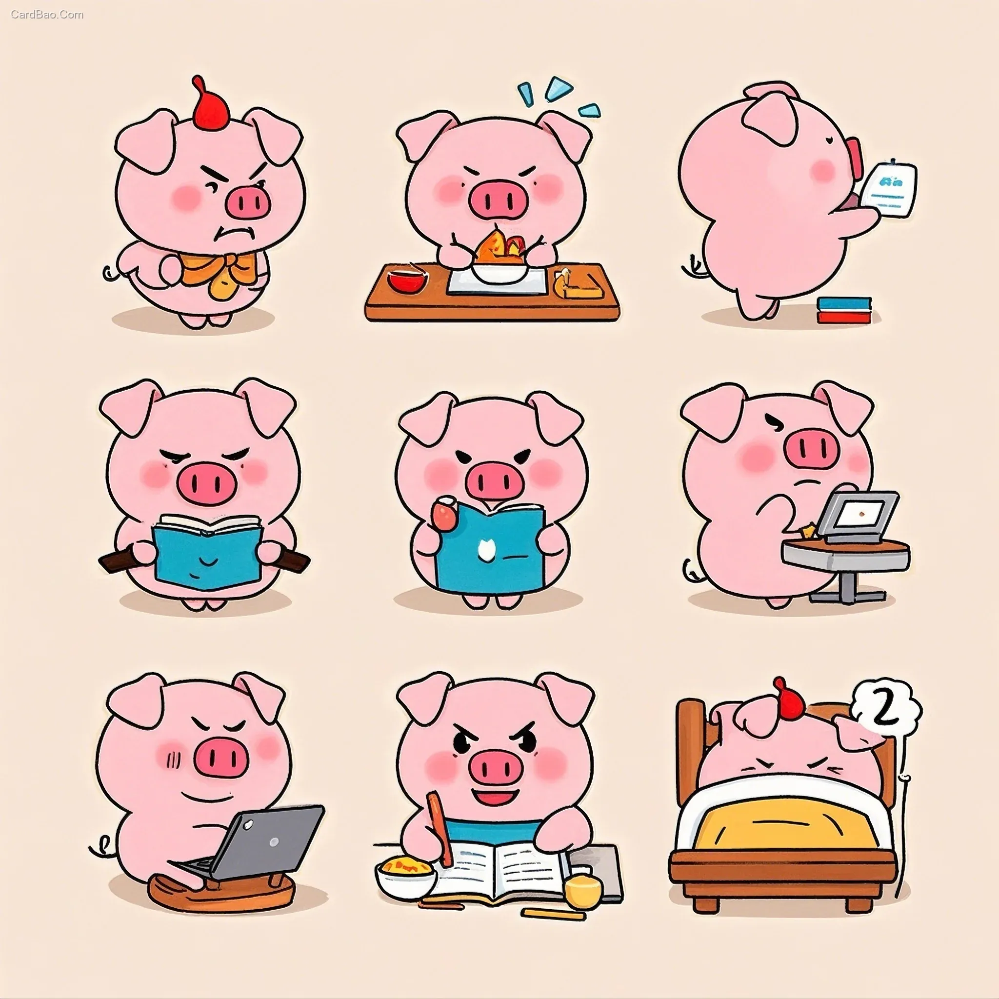 Image generation information: A cute little pig with emoji-like expressions, including various expressions such as angry, happy, depressed, and worried, showcasing different emotions; different poses in scenarios like at work, eating, in class, going to work, sleeping, studying, and small daily life scenes; minimalist, hand-drawn illustration style, with light colors as the main tone.