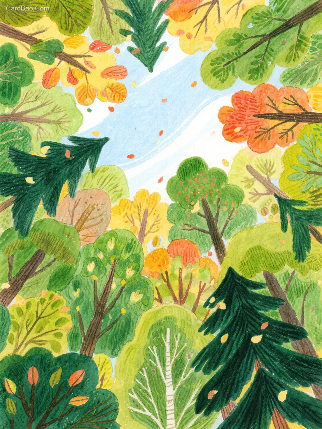 Isabelle Arsenault 风格的儿童图画书插图,秋天,仰望天空,郁郁葱葱的森林,生机勃勃,绿意盎然,水彩风插画,大师级构图,高清图,多彩