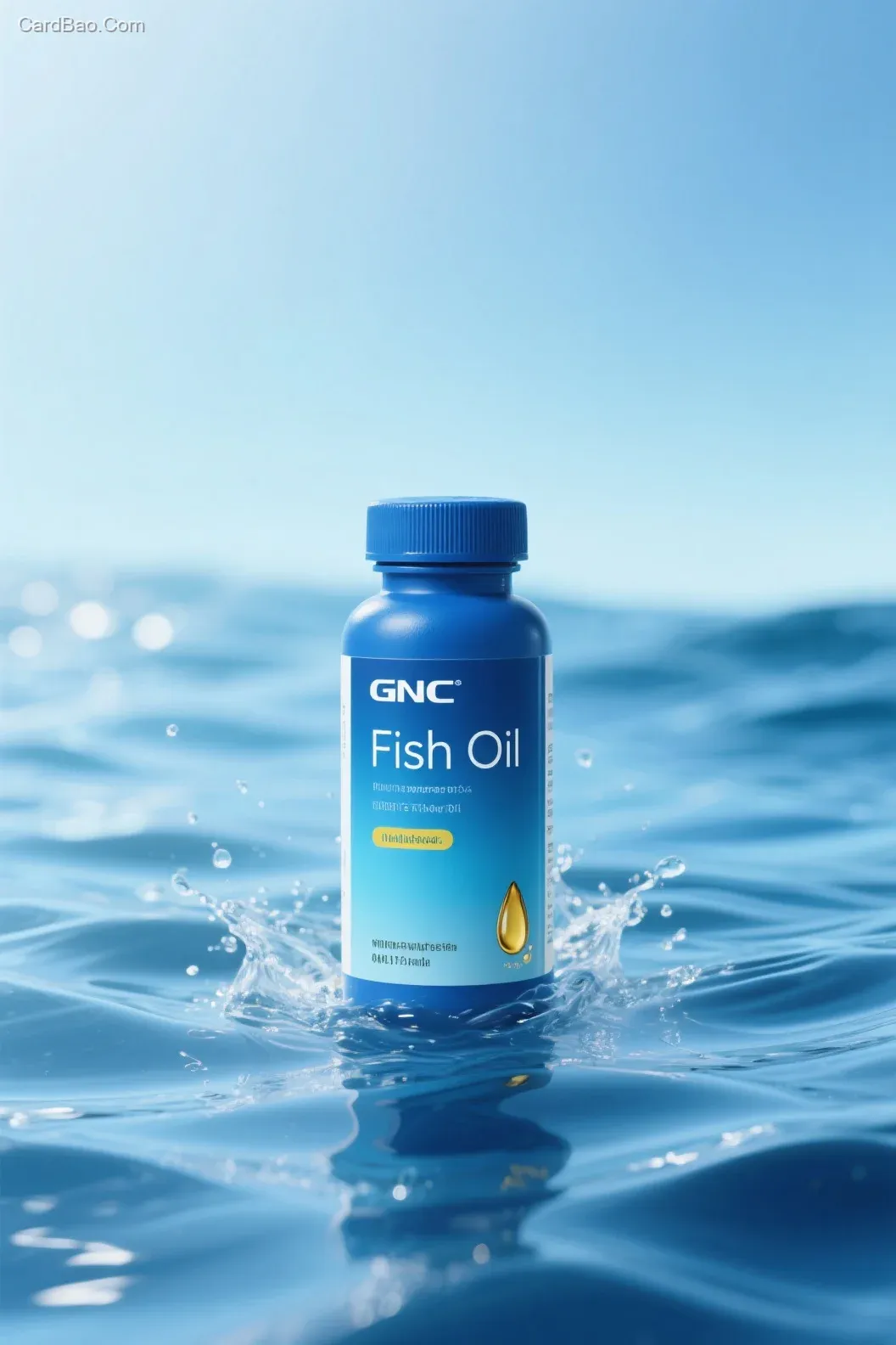Front view: A blue gradient fish oil bottle stands in the center of the frame, set against a pure gradient background transitioning from light blue to deep blue, simulating the flowing texture of ocean wave patterns. The label on the bottle is clearly marked "GNC Fish Oil," with water splashes surrounding the product. The image is soft and bright, highlighting a sense of natural purity.