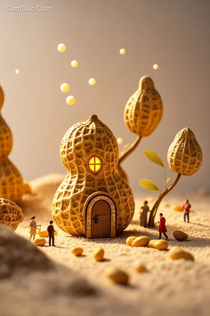 Macro shooting, macro photography, miniature landscape, microscopic world, giant peanut house, clean background, minimalism, nice sunlight, warm, minimal, simple, soft, dreamy, fairy-tale world, Instagram style, Instagram, imaginative image, fresh and clean, bright, clean background, simple, close-up, minimalism, cute