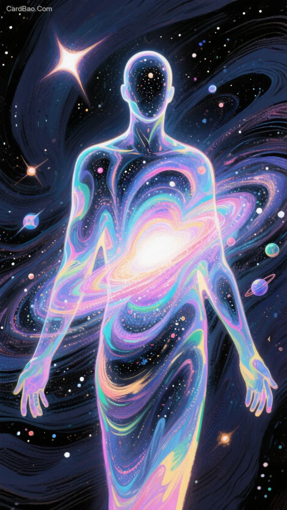 ,混沌透明的宇宙星云漩涡中心一个宇宙神明隐约出现,身体透明飘渺由流动星空,星云,星体组成,无面人,多重面幻像 虚与实 虚影动态模糊,色彩致幻 曜变 动态模糊,荧光笔马克笔结构平涂 超细节 , 意识流绘画,荧光光影流动,胶片感拍摄,新视觉