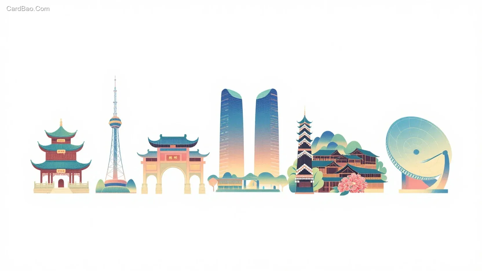 贵州城市地标插画,所有元素在一排,前后错落,看着像一个整体,甲秀楼、文昌阁、筑城广场、千户苗寨、贵阳花果园双子塔、贵州电视塔,中国天眼,国潮艺术手绘矢量风格,渐变色彩,白色背景,画面中不出现任何文字,不要超出画布,不要排列两排