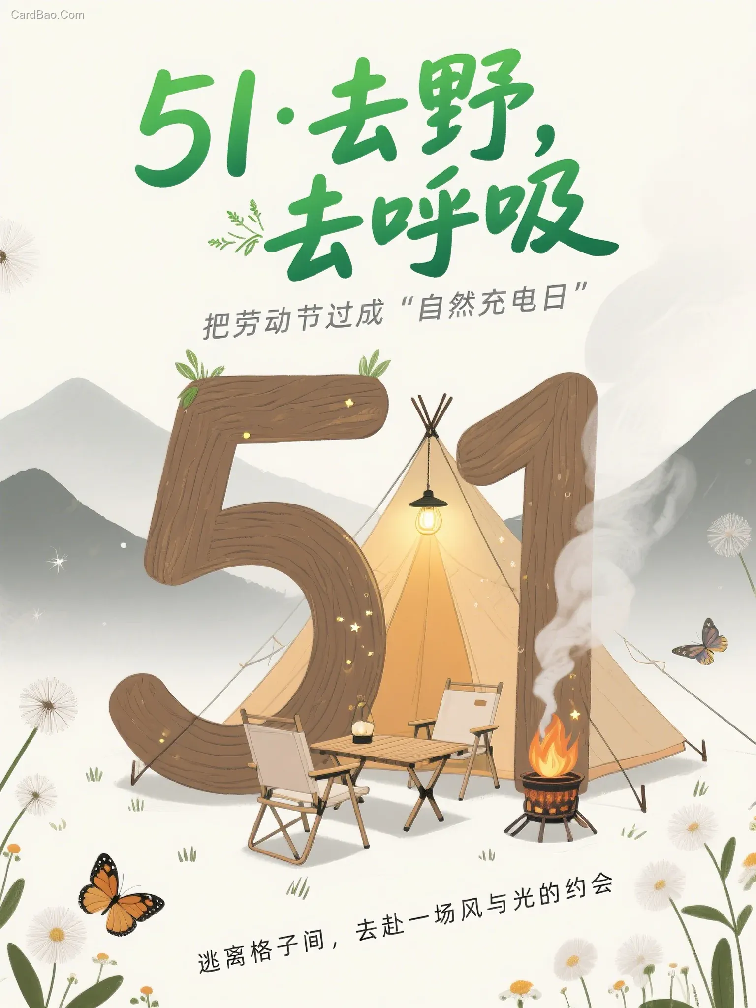 手绘插画风格露营场景,数字"51"变形为木质纹理帐篷支架与炊烟造型,帐篷内露出折叠桌椅和星空灯。环绕山峦剪影、蒲公英和蝴蝶元素,主标题"51·去野,去呼吸"用渐变绿手写字体,"野"字带小草装饰,副标题"把劳动节过成'自然充电日'"浅灰无衬线字体,底部斜置小字"逃离格子间,去赴一场风与光的约会"。莫兰迪色系淡彩晕染,画面留白处点缀露营车和登山杖图标,自然肌理纸张质感