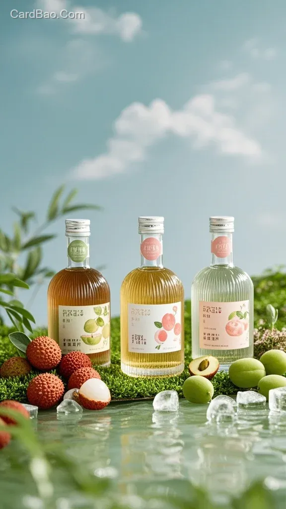 背景为户外场景蓝天白云地上散落着荔枝、青梅、白桃还摆放着一些龙井茶叶,前景为三款不同口味的果酒摆放在中央,突出产品,放大产品,景深感,冰块,高级感,晶莹剔透,酒水海报,海报设计,商业摄影