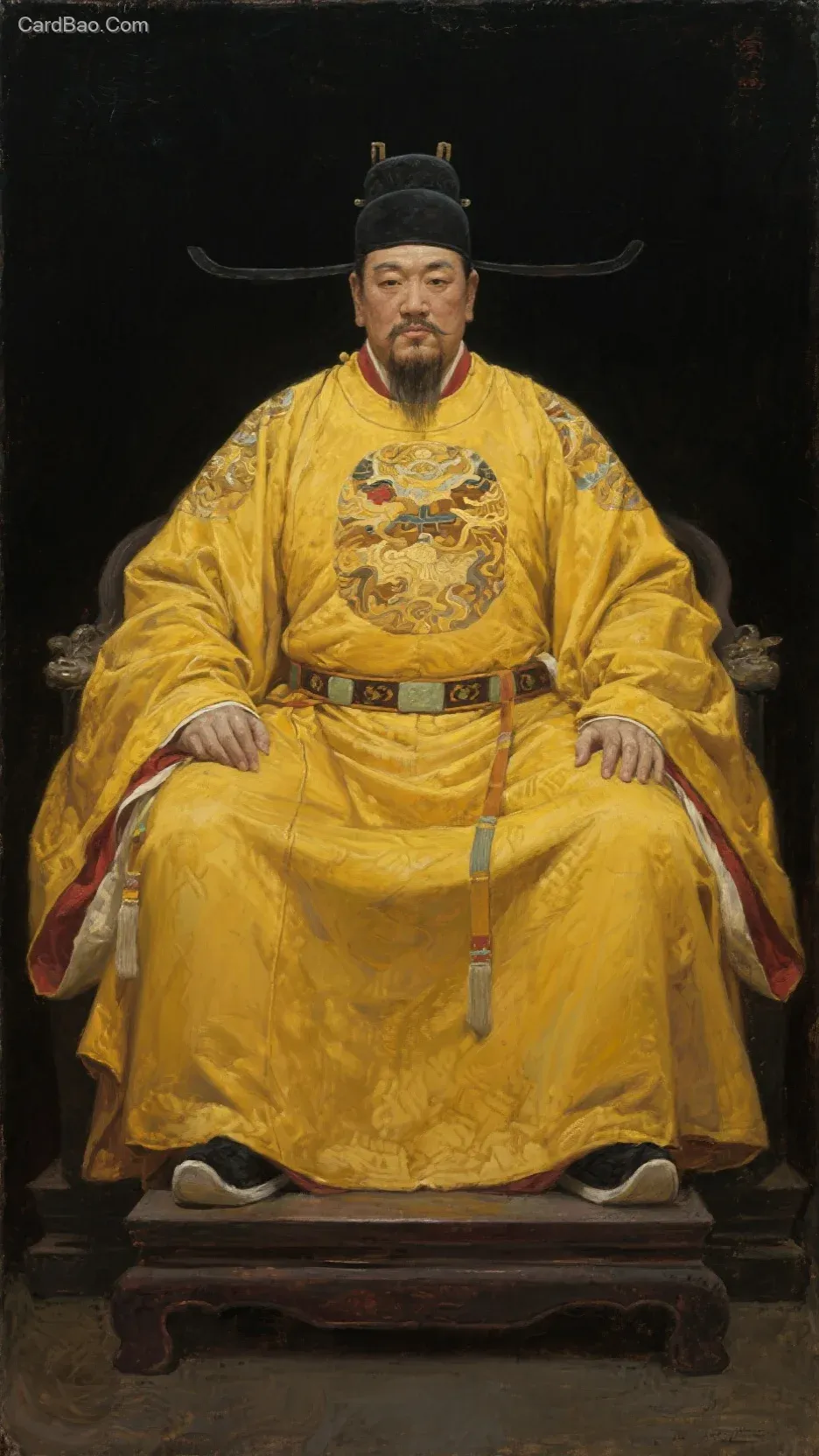 朱元璋身穿黄袍坐像,油画写实风格暗黑