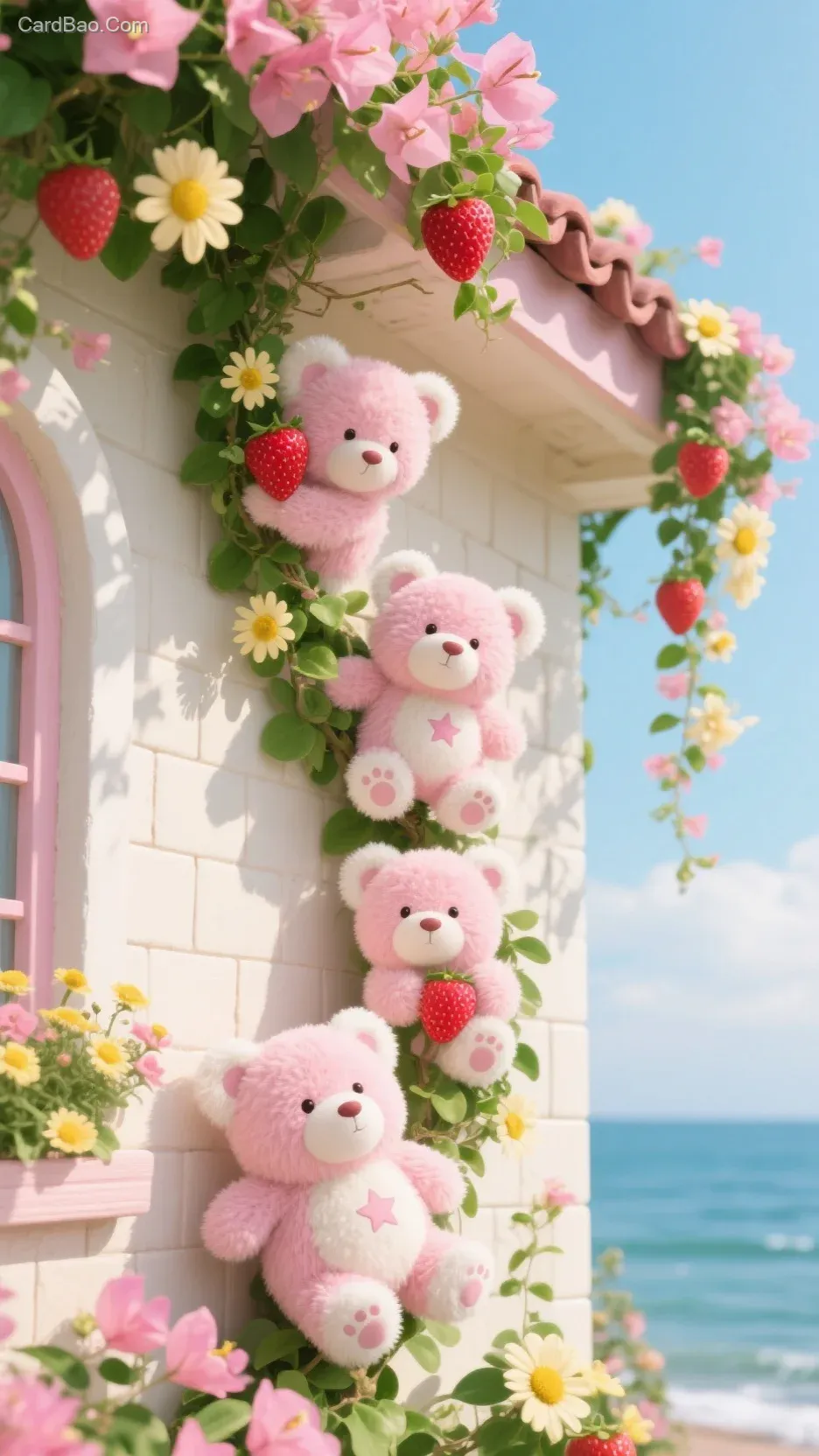 This house in Guangdong seems to have been kissed by spring. Its off-white walls are entwined with emerald green vines, while pink bougainvillea and pale yellow daisies dangle from the eaves, as if tying a colorful floral sash around the house. Even more delightfully, several strawberry bears are slowly climbing up along the flowering vines—their fluffy bodies are a fresh strawberry pink, their ears and paws dusted with milky white fuzz, and their chubby tummies dappled with tiny red spots, as if freshly drizzled with strawberry jam. Sunlight filters through the petals and spills over them, casting their shadows on the wall bricks, swaying gently. It feels as if the next second, a bear paw might pluck a flower and tuck it behind an ear, turning the entire house into a breathing, strawberry-scented fairy tale book—even the sea breeze carries a sweet, lingering fragrance.